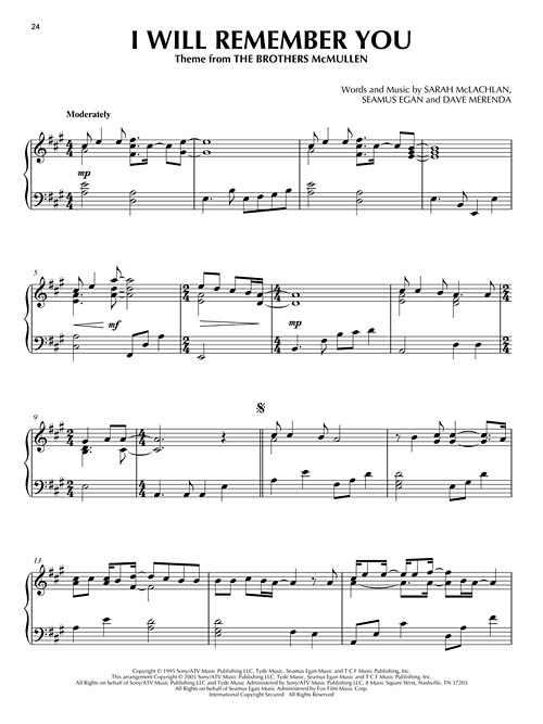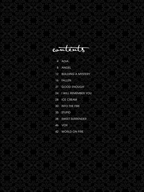 Great piano solo arrangements of a dozen McLachlan hits: Adia • Angel • Building a Mystery • Fallen • Good Enough • I Will Remember You • Ice Cream • Into the Fire • Stupid • Sweet Surrender • Vox • World on Fire.