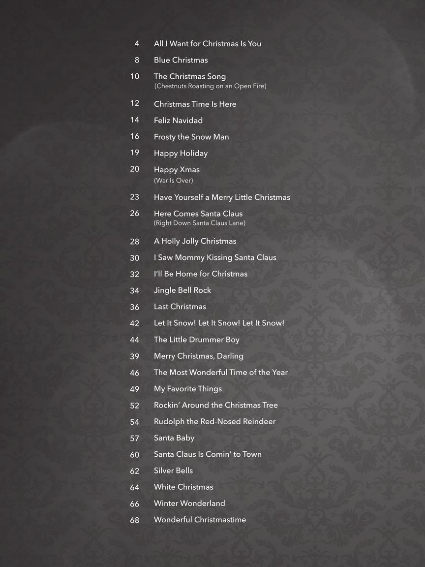 28 canções natalinas com arranjos facilitados para violão; incluindo: All I Want for Christmas Is You • The Christmas Song (Chestnuts Roasting on an Open Fire) • Christmas Time Is Here • Have Yourself a Merry Little Christmas • I Saw Mommy Kissing Santa Claus • I'll Be Home for Christmas • Jingle Bell Rock • Last Christmas • My Favorite Things • Rockin' Around the Christmas Tree • Santa Baby • Silver Bells • White Christmas • Wonderful Christmastime • e outras!