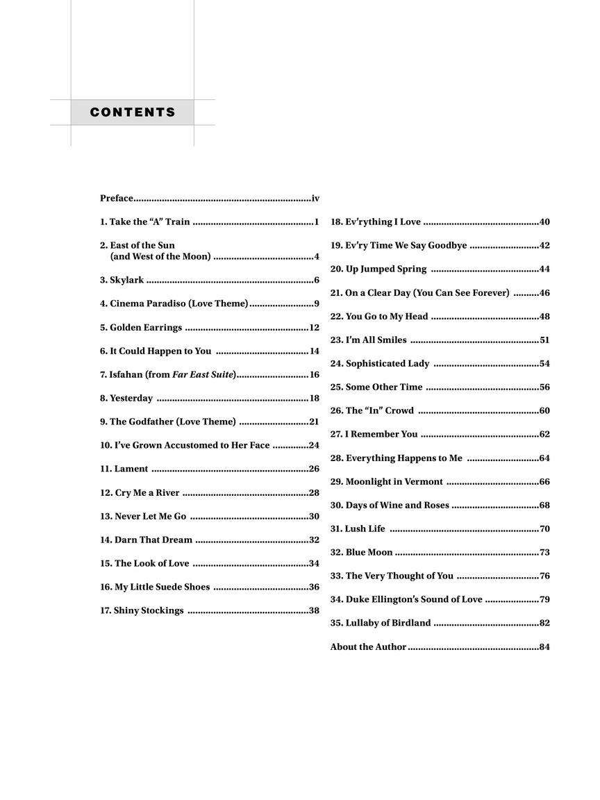 Incluindo clássicos do jazz como: Cry Me a River • Days of Wine and Roses • Ev'ry Time We Say Goodbye • I Remember You • I've Grown Accustomed to Her Face • It Could Happen to You • The Look of Love • Lullaby of Birdland • Lush Life • Moonlight in Vermont • On a Clear Day (You Can See Forever) • Skylark • Sophisticated Lady • Take the “A” Train • Up Jumped Spring • The Very Thought of You • Yesterday • e outros!