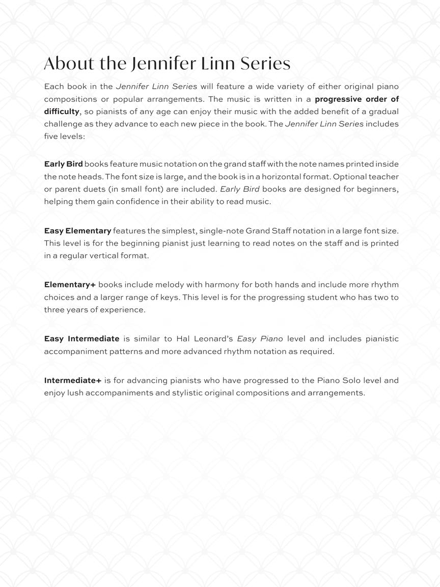 This volume of the Jennifer Linn Series takes piano students around the world with 12 carefully-leveled arrangements of Christmas songs. The songs are presented in a progressive order so students can learn new skills as they advance through the book.