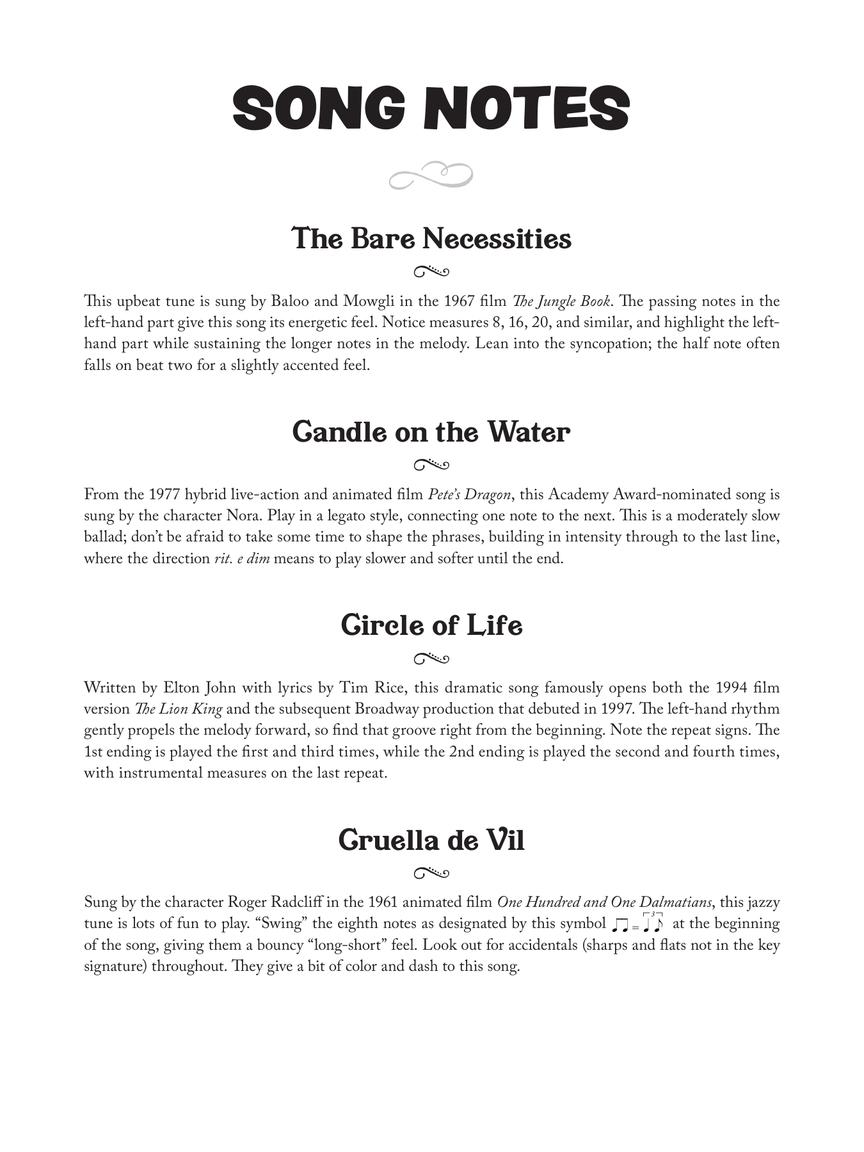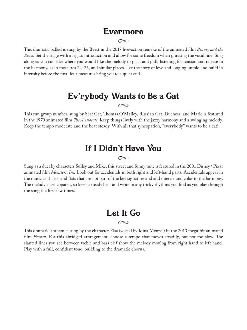 Kids learning to play the piano will love to play the 20 Disney hits in this collection, arranged for easy piano with helpful practice tips for learning each song. Includes: The Bare Necessities (from The Jungle Book) • Circle of Life (from The Lion King) • Evermore (from Beauty and the Beast) • Let It Go (from Frozen) • Remember Me (from Coco) • Touch the Sky (from Brave) • When Will My Life Begin? (from Tangled) • A Whole New World (from Aladdin) • You're Welcome (from Moana) • You've Got a Friend in Me (from Toy Story) • and more.