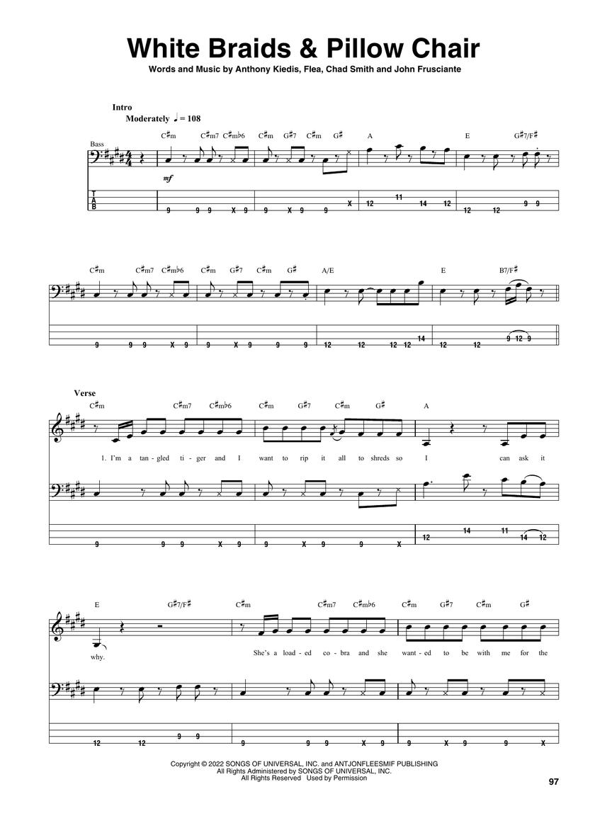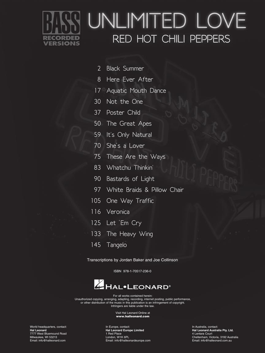 Unlimited Love is the long-awaited Red Hot Chili Peppers' 2022 release. This folio features all 17 tracks with every note Flea plays transcribed note for note in notes and tab with lyrics. Songs include: Aquatic Mouth Dance • Bastards of Light • Black Summer • The Great Apes • The Heavy Wing • Here Ever After • It's Only Natural • Let 'Em Cry • Not the One • One Way Traffic • Poster Child • She's a Lover • Tangelo • These Are the Ways • Veronica • Whatchu Thinkin' • White Braids & Pillow Chair.