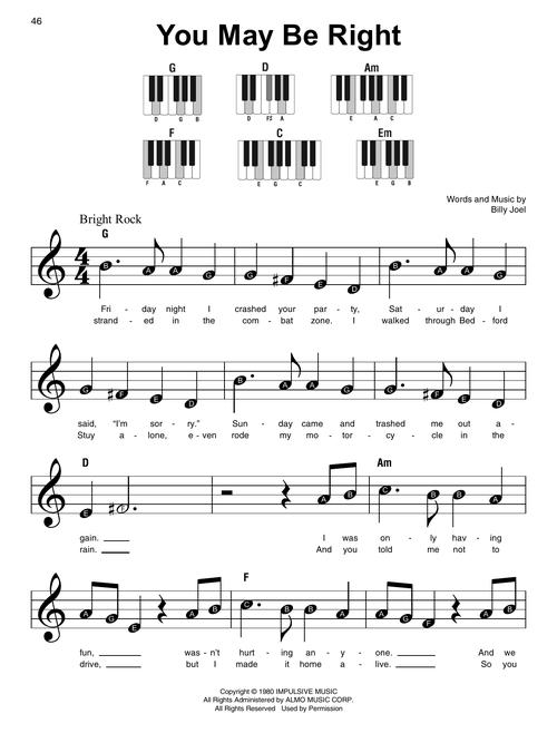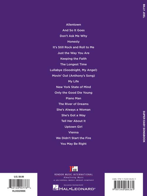It's super easy! This series features accessible arrangements for piano, with simple right-hand melody, letter names inside each note, basic left-hand chord diagrams, lyrics, and no page turns. This edition includes 22 of the Piano Man's hits: And So It Goes · Honesty · It's Still Rock and Roll to Me · Just the Way You Are · The Longest Time · Movin' Out (Anthony's Song) · New York State of Mind · Only the Good Die Young · Piano Man · She's Always a Woman · Uptown Girl · We Didn't Start the Fire · and more.