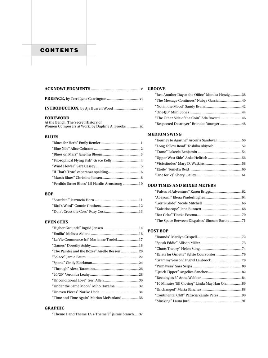 Terri Lyne Carrington, fundadora e diretora artística do Berklee Institute of Jazz and Gender Justice, fez a curadoria de uma ampla gama de composições de jazz escritas por mulheres compositoras, do obscuro ao popular, histórico ao atual, do blues ao bebop e muito mais nesta importante coleção. Estas composições são complementares e alternativas ao cânone “jazz standard” que tem servido estudantes, professores e profissionais ao longo do desenvolvimento da música jazz. As composições abrangem quase um século, incluindo o trabalho de Lil Hardin Armstrong de 1922 a músicas escritas em 2021 por recém-formados do Instituto. Apresenta 101 composições de uma notável gama de titãs reconhecidos, jovens visionários e heroínas desconhecidos do jazz: Mary Lou Williams, Alice Coltrane, Esperanza Spalding, Geri Allen, Maria Schneider, Cecile McLorin Salvant, Cassandra Wilson, Dianne Reeves, Dorothy Ashby, Nubya Garcia, Nicole Mitchell e muitas outras. O livro inclui uma peça de 1922 da influente Lil Hardin Armstrong e músicas escritas em 2021 por artistas emergentes do Berklee Institute of Jazz and Gender Justice de Carrington. New Standards também celebra o mundo global do jazz, da saxofonista tenor chilena Melissa Aldana a pianista nipo-americana Toshiko Akiyoshi e outros compositores internacionais.