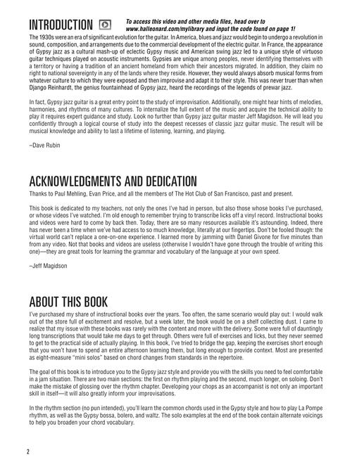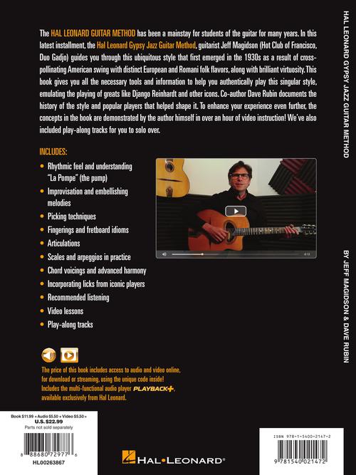 The Hal Leonard Guitar Method has been a mainstay for students of the guitar for many years. In this latest installment, the Hal Leonard Gypsy Jazz Guitar Method, guitarist Jeff Magidson (Hot Club of Francisco, Duo Gadjo) guides you through this ubuquitous style that first emerged in the 1930s as a result of cross-pollinating American swing with distinct European and Romani folk flavors, along with brilliant virtuosity. This book gives you all the necessary tools and information to help you authentically play this singular style, emulating the playing of greats like Django Reinhardt and other icons. Co-author Dave Rubin documents the history of the style and popular players that helped shape it. To enhance your experience even further, the concepts in the book are demonstrated by the author himself in over an hour of video instruction! We've also included play-along tracks for you to solo over.