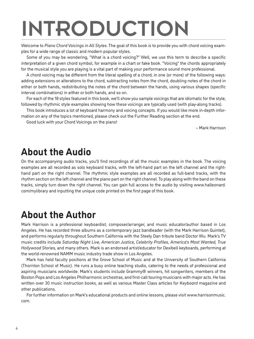 The piano chord voicing concepts are demonstrated with over 90 audio tracks, including play-along rhythm section accompaniment in all the styles!