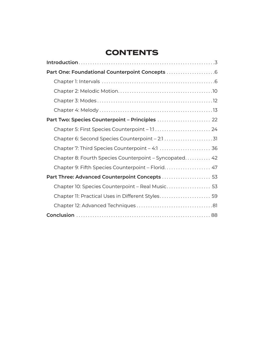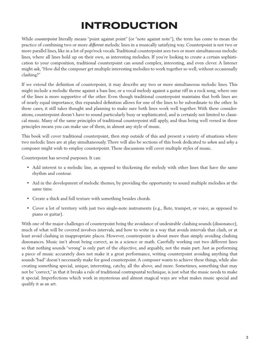 Counterpoint is the technique of composing two or more melodic lines that are sounded at the same time. Whether a guitar riff against a vocal melody, a bass line against a keyboard melody, or a violin and cello duet, in good counterpoint, these musical lines work together while also maintaining a unique identity. This book combines the foundational principles of traditional classical counterpoint with modern-day examples, demonstrating how counterpoint can play an important role in today's popular music. Concepts include: intervals; melodic motion; writing melodies; voice leading; species counterpoint; practical uses in different styles; and more. Includes access to online audio examples of counterpoint analysis and exercises!