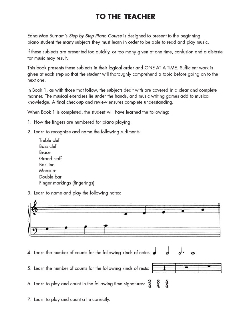 This piano course provides the student the opportunity to experience the joy of playing while learning the rudiments of music in a logical order, with gradual and steady progress, presenting a challenge toward increasing pianistic facility.