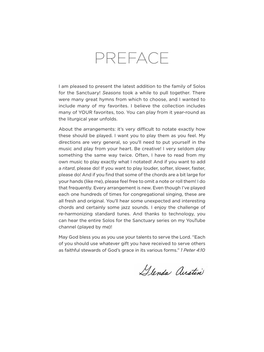 Over 20 new sacred piano solo arrangements from Glenda Austin in an exciting collection that can be picked up year-round as the liturgical year unfolds. Includes songs including two originals and two medleys for the categories of: Advent/Christmas, Epiphany/Ordinary Time, Lent/Easter, Ordinary Time/General Use, National Holidays, Service Music/Communion.