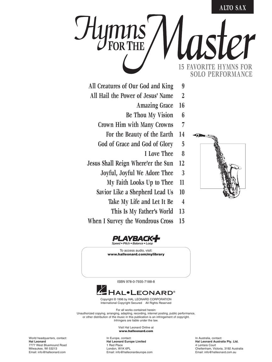 15 inspirational favorites, including: All Hail the Power of Jesus' Name • Amazing Grace • Crown Him with Many Crowns • Joyful, Joyful We Adore Thee • This Is My Father's World • When I Survey the Wondrous Cross • and more.