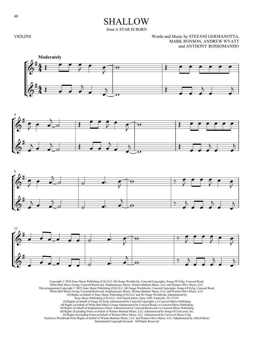 23 pop hits arranged for instrumental duet, including: All Too Well • Bad Habits • Bang! • Blinding Lights • Happier Than Ever • Heat Waves • High Hopes • Señorita • We Don't Talk About Bruno • and more. This edition can be played with two violins or violin and cello.