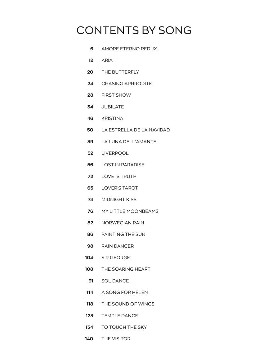 Transcrições para piano; incluindo: The Butterfly • First Snow • Jubilate • La Luna Dell'Amante • Liverpool • Love Is Truth • Lover's Tarot • Norwegian Rain • Painting the Sun • Rain Dancer • The Soaring Heart • The Sound of Wings • Temple Dance • The Visitor • e outras.