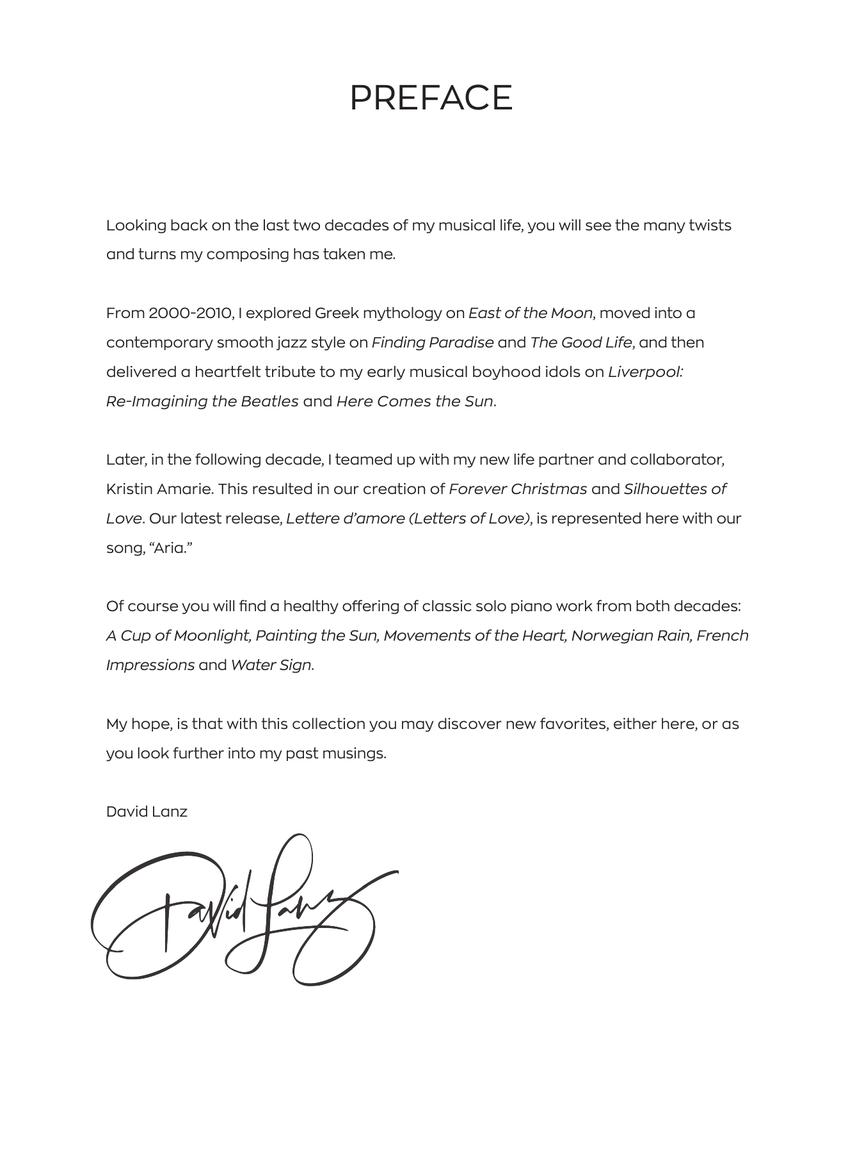 This folio is a highlight collection of 26 songs, selected by new age composer/pianist David Lanz, his albums released 2000-2022. All songs have been transcribed for piano solo and approved by the artist.