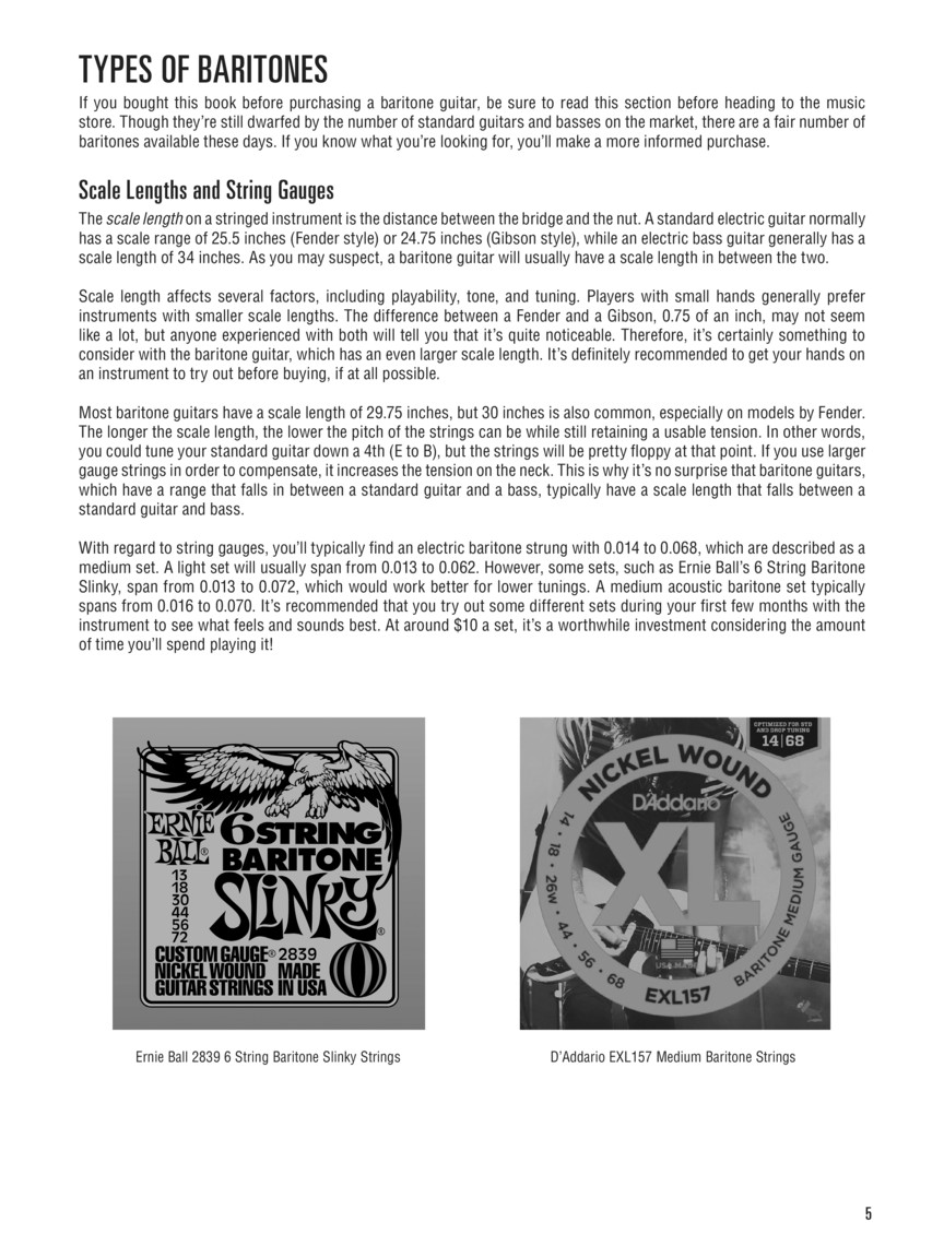 The perfect introduction for anyone just discovering the baritone guitar! This easy-to-use book and audio pack also functions as a crossover method for folks who already play standard guitar or bass guitar. Includes many useful exercises, popular song excerpts in a variety of genres, invalubale tips, and full-band demonstration audio tracks online for download or streaming. Lessons include: tunings, chords & scales, strumming & arpeggios, rhythm tab notation, a variety of styles, and more. Full songs include: Bonnie Came Back (Duane Eddy) • Crazy (Patsy Cline) • and The Space Between (Dave Matthews Band). Song excerpts include: Invisible (Metallica) • Lie (Dream Theater) • Rock Lobster (B-52's) • and more.