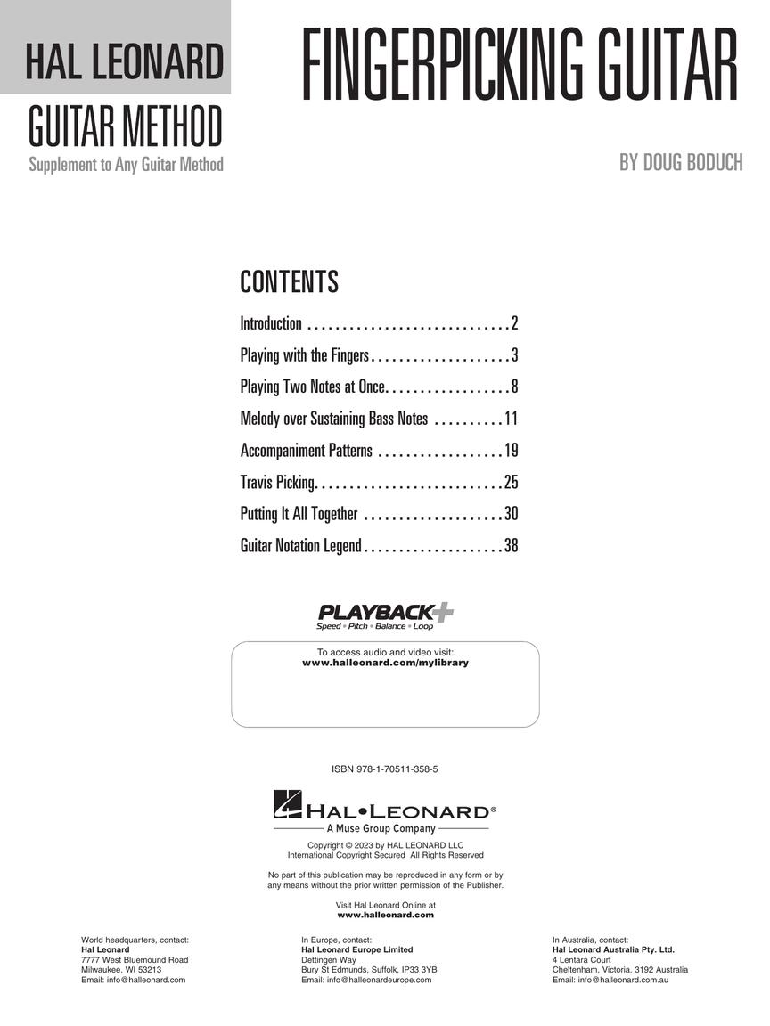 The Hal Leonard Guitar Method has been a mainstay for students of the guitar for many years. In this latest installment, the Hal Leonard Fingerpicking Guitar Method, guitarist Doug Boduch fast-tracks you through the fundamentals, utilizing familiar songs that are guaranteed to help you master this essential way of playing. Topics include how to play with the pick-hand fingers, playing multiple lines at once, accompaniment patterns, Travis picking, and much more! To help you achieve success in the best way possible, we've also included solo guitar audio and video demos of the author playing through the examples. Two dozen songs are featured, including: Africa • Blackbird • Dust in the Wind • Landslide • Rolling in the Deep • Shallow • and more!