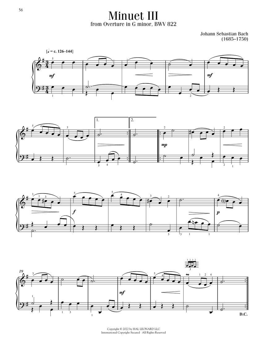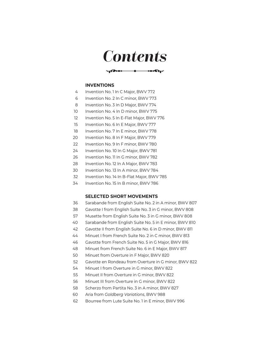 The Classical Piano Sheet Music Series includes compilations of intermediate level pieces, with convenient coil binding so the music lays flat, ensuring smooth page turns. Includes: Inventions Nos. 1-15, BWV 772-786; Sarabande from English Suite No. 2 in A minor, BWV 807; Gavotte I from English Suite No. 3 in G minor, BWV 808; Musette from English Suite No. 3 in G minor, BWV 808; Sarabande from English Suite No. 5 in E minor, BWV 810; Gavotte II from English Suite No. 6 in D minor, BWV 811; Minuet I from French Suite No. 2 in C minor, BWV 813; Gavotte from French Suite No. 5 in G Major, BWV 816; Minuet from French Suite No. 6 in E Major, BWV 817; Minuet from Overture in F Major, BWV 820; Gavotte en Rondeau from Overture in G minor, BWV 820; Minuet I from Overture in Gminor, BWV 822; Minuet II from Overture in G minor, BWV 822; Minuet III from Overture in G minor, BWV 822; Scherzo from Partita No. 3 in A minor, BWV 827; Aria from Goldberg Variations, BWV 988; Bourrée from Lute Suite No. 1 in E minor, BWV 996; Prelude from Suite in F minor BWV 823; Prelude No. 1 in C Major from The Well-Tempered Clavier, Book 1, BWV 846; Prelude No. 2 in C minor from The Well-Tempered Clavier, Book 1, BWV 847; Preludes, BWV 924-928, 930-931, 933-943, 999.