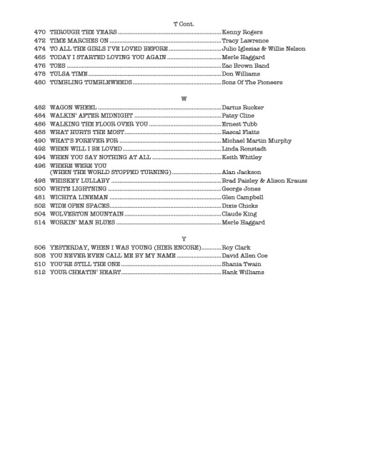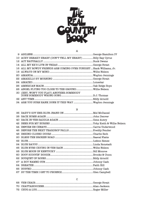 Country gets real in this new collection in the Real Book series featuring over 275 country favorites presented in the “Real Book” look with lead sheets and lyrics. Songs include: Act Naturally • All My Rowdy Friends Are Coming over Tonight • Always on My Mind • Amazed • Beer for My Horses • Before He Cheats • Bless the Broken Road • Blue Moon of Kentucky • Boot Scootin' Boogie • A Boy Named Sue • Breathe • City of New Orleans • Coal Miner's Daughter • Could I Have This Dance • Coward of the County • Crazy • Delta Dawn • The Devil Went down to Georgia • Don't It Make My Brown Eyes Blue • Elvira • Family Tradition • Folsom Prison Blues • Forever and Ever, Amen • Friends in Low Places • The Gambler • Gentle on My Mind • God Bless the U.S.A. • Help Me Make It Through the Night • Here's a Quarter (Call Someone Who Cares) • Hey, Good Lookin' • I Hope You Dance • (I Never Promised You A) Rose Garden • I Will Always Love You • I've Got a Tiger by the Tail • Islands in the Stream • Jackson • Jambalaya (On the Bayou) • King of the Road • Live like You Were Dying • Lucille • Mama Tried • Mean • On the Road Again • Redneck Woman • Ring of Fire • Rocky Top • She Believes in Me • Southern Nights • Stand by Your Man • There's a Tear in My Beer • When You Say Nothing at All • Your Cheatin' Heart • and more.