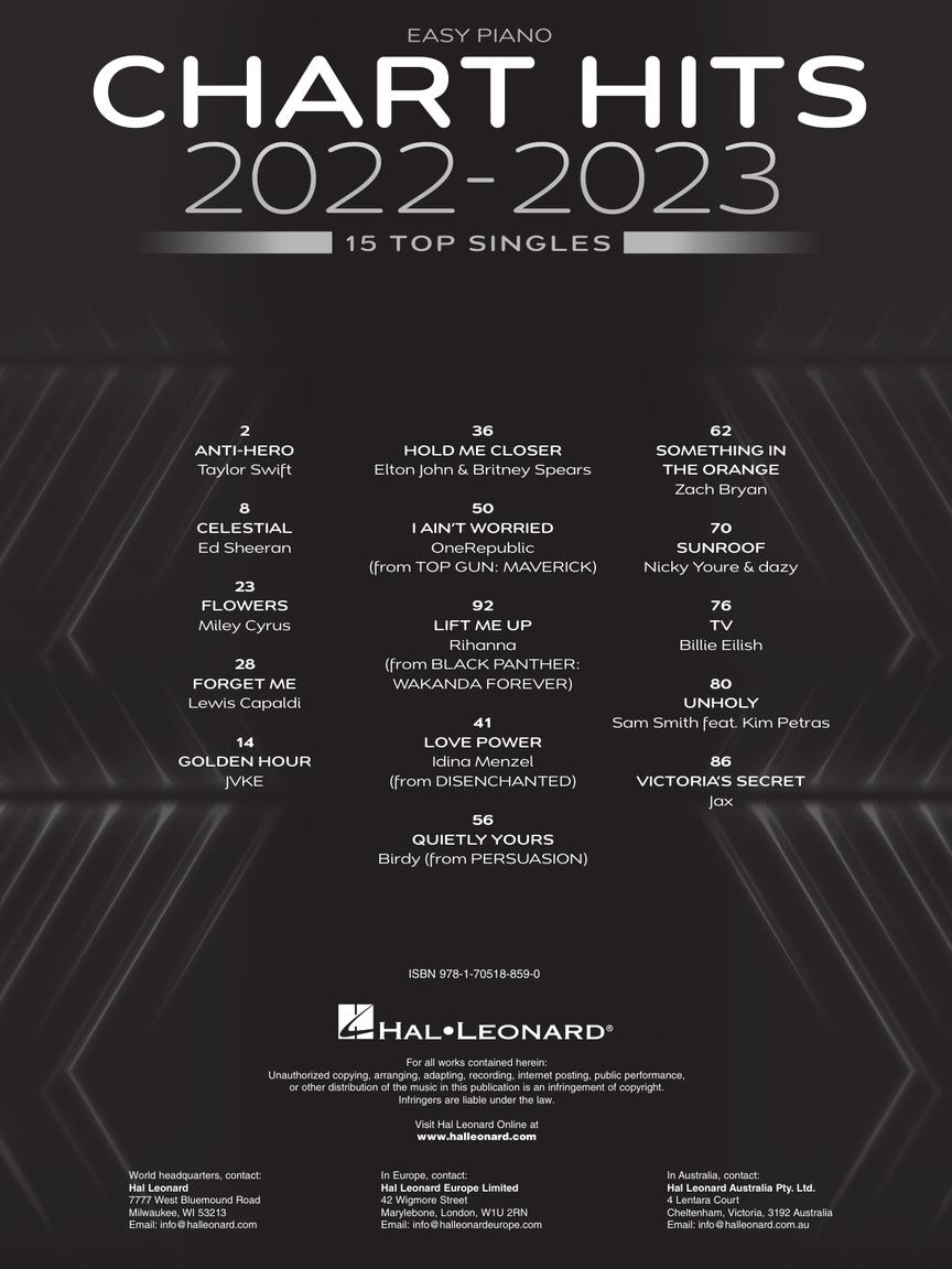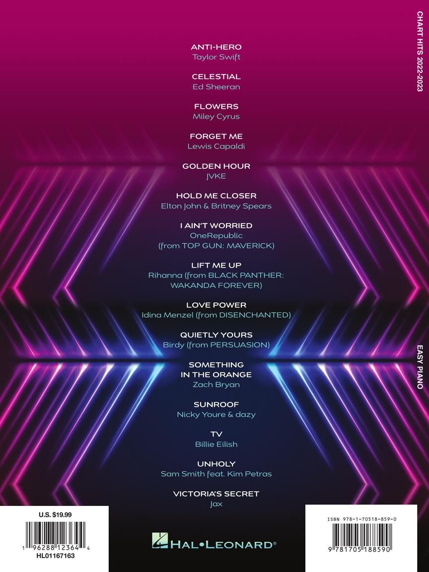 15 of today's biggest hits arranged for easy piano with lyrics, including: Anti-Hero • Celestial • Flowers • Forget Me • Golden Hour • Hold Me Closer • I Ain't Worried • Lift Me Up • Love Power • Quietly Yours • Something in the Orange • Sunroof • TV • Unholy • Victoria's Secret.