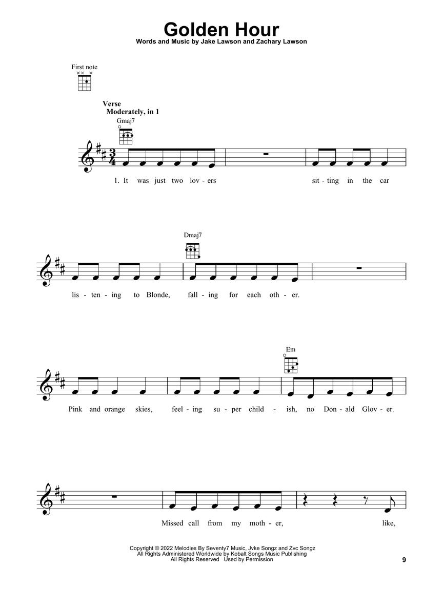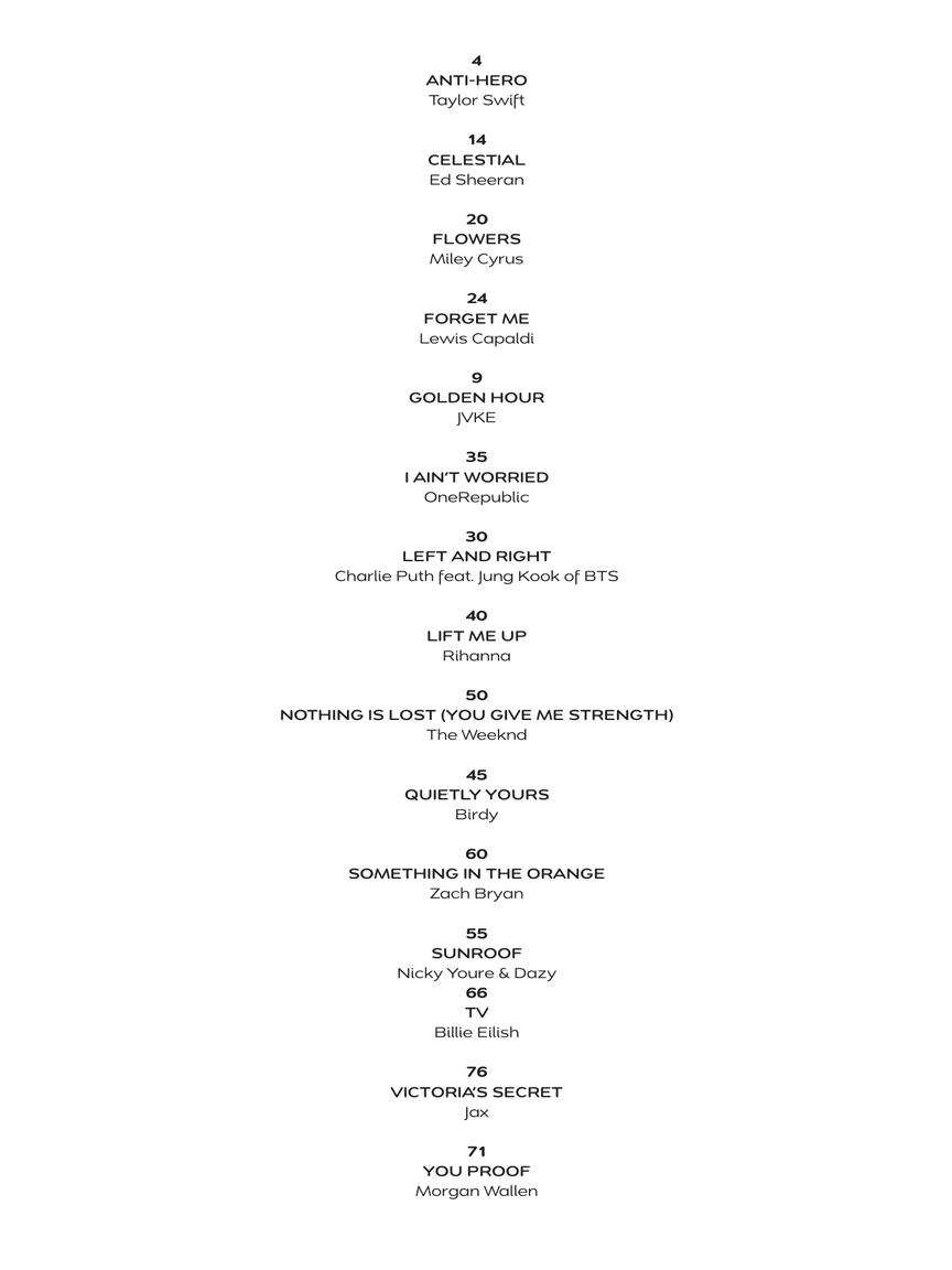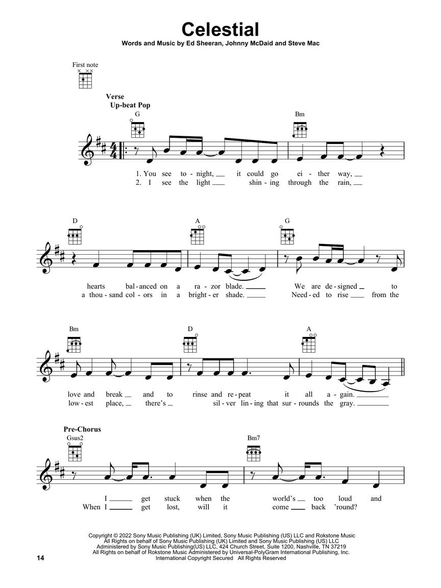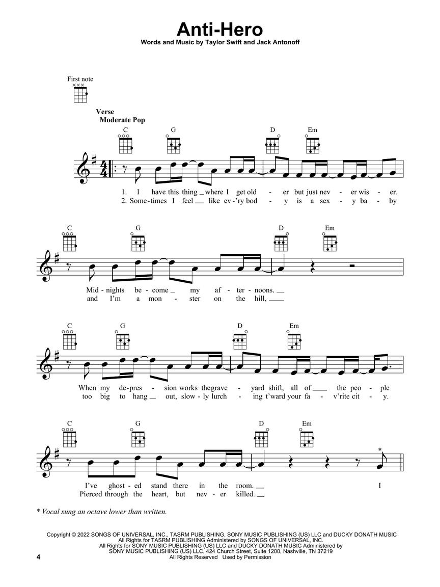 15 top hits arranged for ukulele with lyrics including: Anti-Hero (Taylor Swift) • Celestial (Ed Sheeran) • Flowers (Miley Cyrus) • Forget Me (Lewis Capaldi) • Golden Hour (JVKE) • I Ain't Worried (OneRepublic) • Left and Right (Charlie Puth feat. Jung Kook) • Lift Me Up (Rihanna) • Nothing Is Lost (You Give Me Strength) (The Weeknd) • Quietly Yours (Birdy) • Something in the Orange (Zach Bryan) • Sunroof (Nicky Youre and Dazy) • TV (Billie Eilish) • Victoria's Secret (Jax) • You Proof (Morgan Wallen).