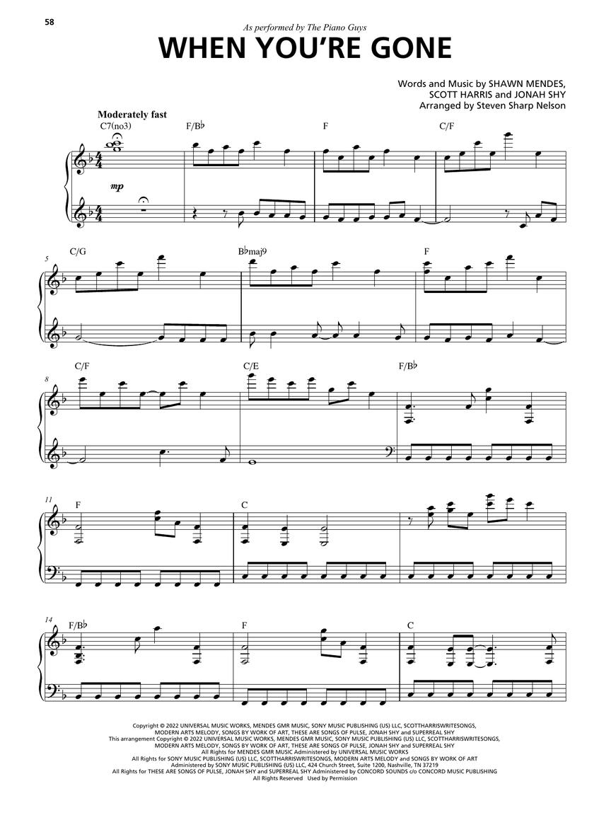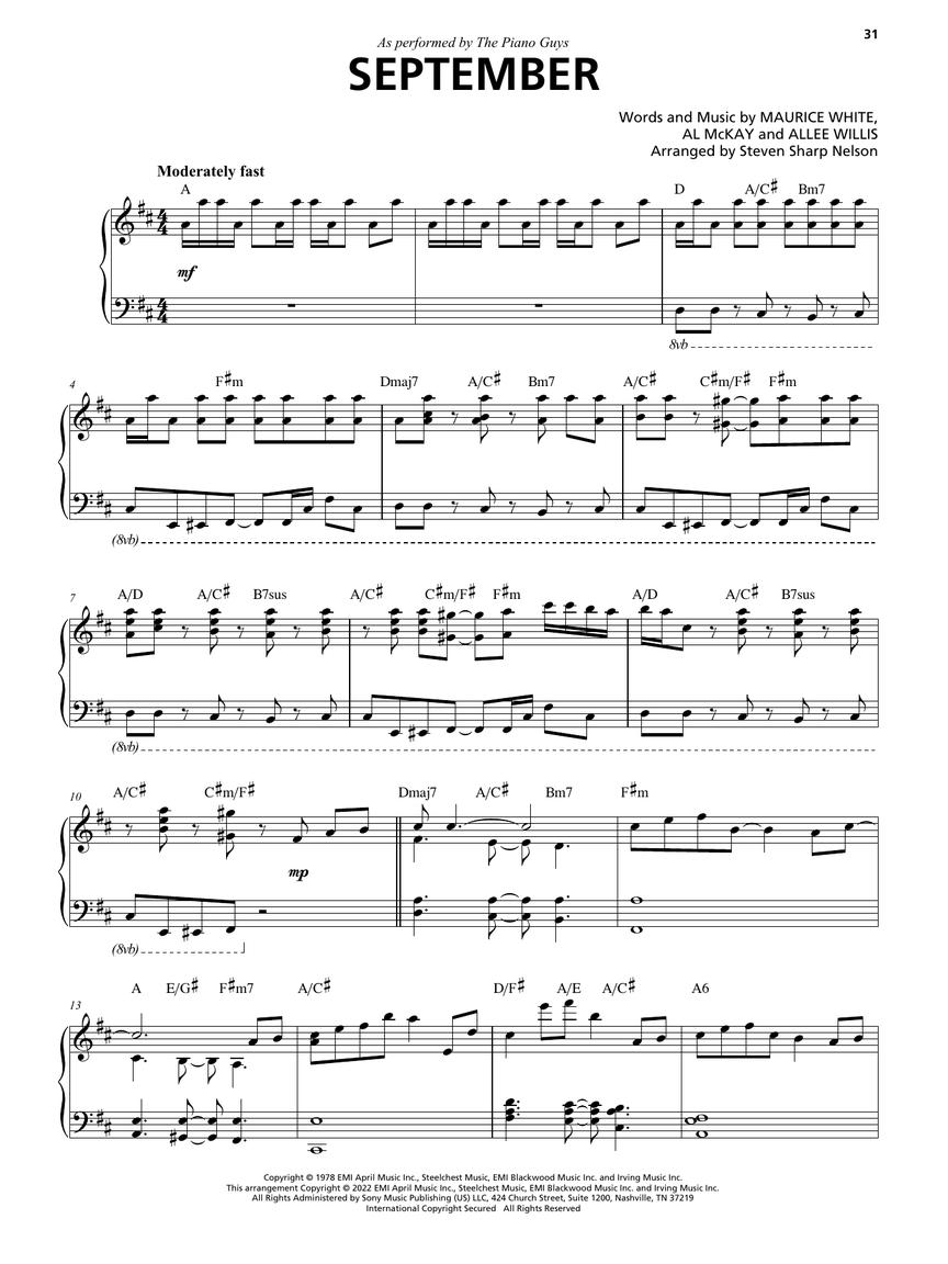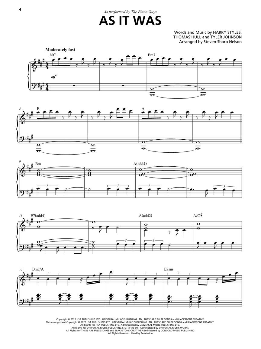 The Piano Guys are known for their creative and fun arrangements of popular tunes. Now you can add some of that flair to your playing with this collection of 12 fun favorites as performed by the Piano Guys! Each song is arranged for piano solo with chord symbols. Titles include: As It Was • Bless the Broken Road • Eye of the Tiger • Ghost • I Will Always Love You • Never Gonna Give You Up • Perfect • September • Someone like You • Sweet Child O' Mine • Unstoppable • When You're Gone.