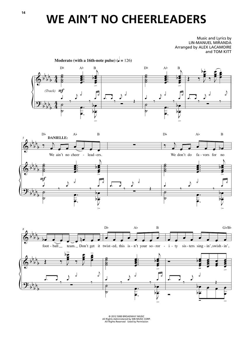 In 2000, the Bring It On hit movie theaters nationwide, presenting a fictitious story focusing on the competitive world of cheerleading and the rivalries it espouses. The stage musical version of the film, featuring music by Tom Kitt and Lin-Manuel Miranda, premiered in Atlanta in 2011, and then ran on Broadway in 2012. Our songbook presents a dozen songs from the musical in vocal line with piano accompaniment arrangements.