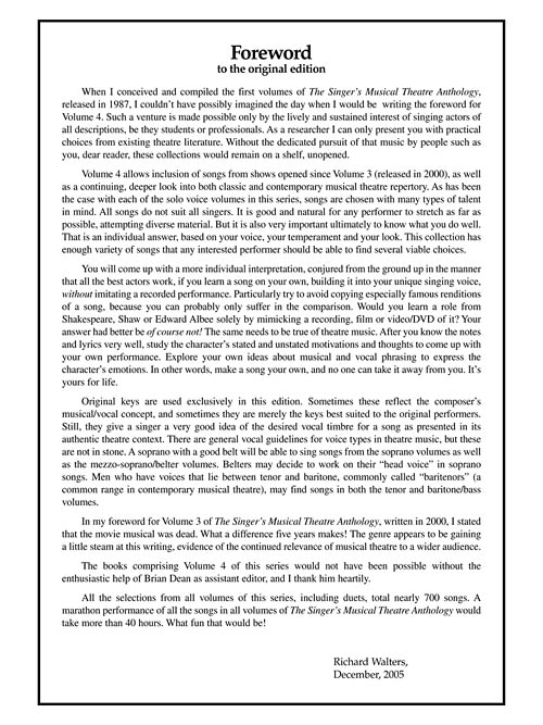 Transcrições autênticas de cada música nas tonalidades originais. As músicas foram escolhidas criteriosamente para cada tipo de voz a partir de uma vasta seleção de espetáculos clássicos e contemporâneos. A gravação inclui acompanhamento de piano.