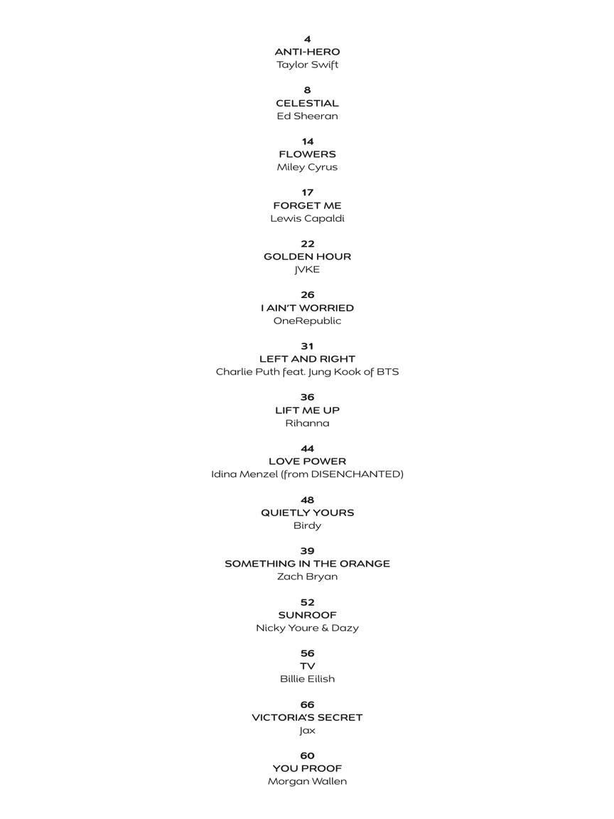15 chart-topping hits from 2022-2023 arranged for easy guitar with notes and tab and full lyrics. Songs include: Anti-Hero (Taylor Swift) • Celestial (Ed Sheeran) • Flowers (Miley Cyrus) • Forget Me (Lewis Capaldi) • Golden Hour (JVKE) • I Ain't Worried (OneRepublic) • Left and Right (Charlie Puth (feat. Jung Kook of BTS) • Lift Me Up (Rihanna) • Love Power (Idina Menzel from Disenchanted) • Quietly Yours (Birdy) • Something in the Orange (Zach Bryan) • Sunroof (Nicky Youre and Dazy) • TV (Billie Eilish) • Victoria's Secret (Jax) • You Proof (Morgan Wallen).