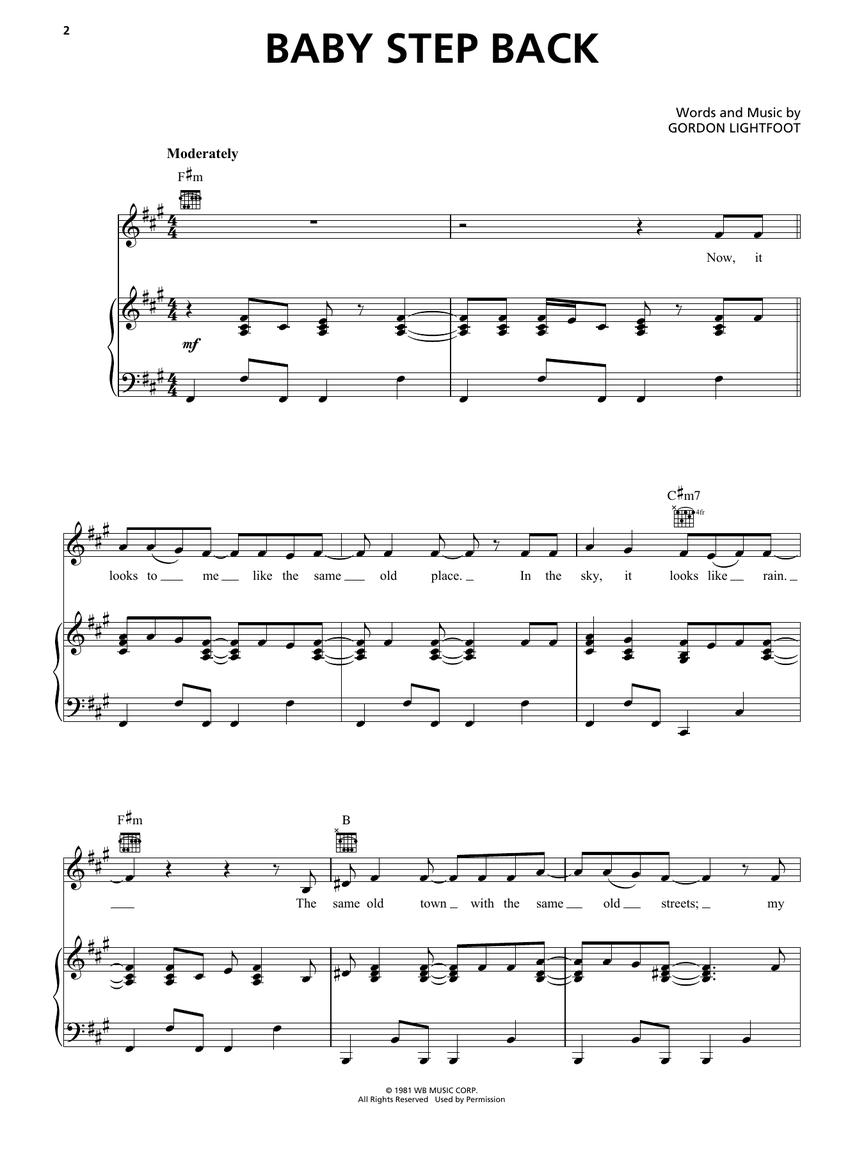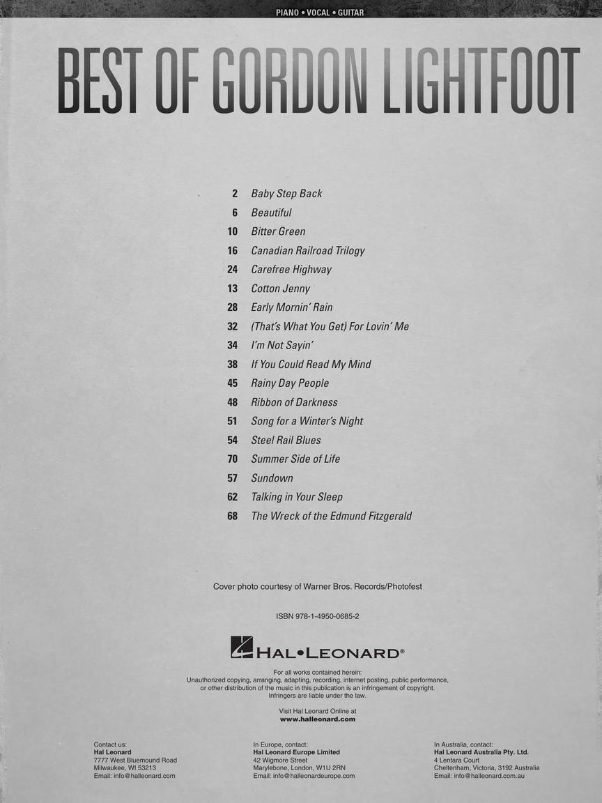 18 of the best-loved songs from this legendary folk rock singer/songwriter are presented for piano, voice and guitar: Carefree Highway • Early Mornin' Rain • If You Could Read My Mind • Rainy Day People • Sundown • Talking in Your Sleep • The Wreck of the Edmund Fitzgerald • and more.