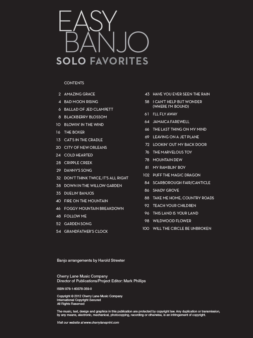 Here are nearly 40 pop, rock and folk favorites – all arranged for the banjo! Includes: Amazing Grace • Ballad of Jed Clampett • Blackberry Blossom • Cripple Creek • Danny's Song • Duelin' Banjos • Fire on the Mountain • Foggy Mountain Breakdown • Grandfather's Clock • Scarborough Fair/Canticle • Take Me Home, Country Roads • Teach Your Children • This Land Is Your Land • and more.