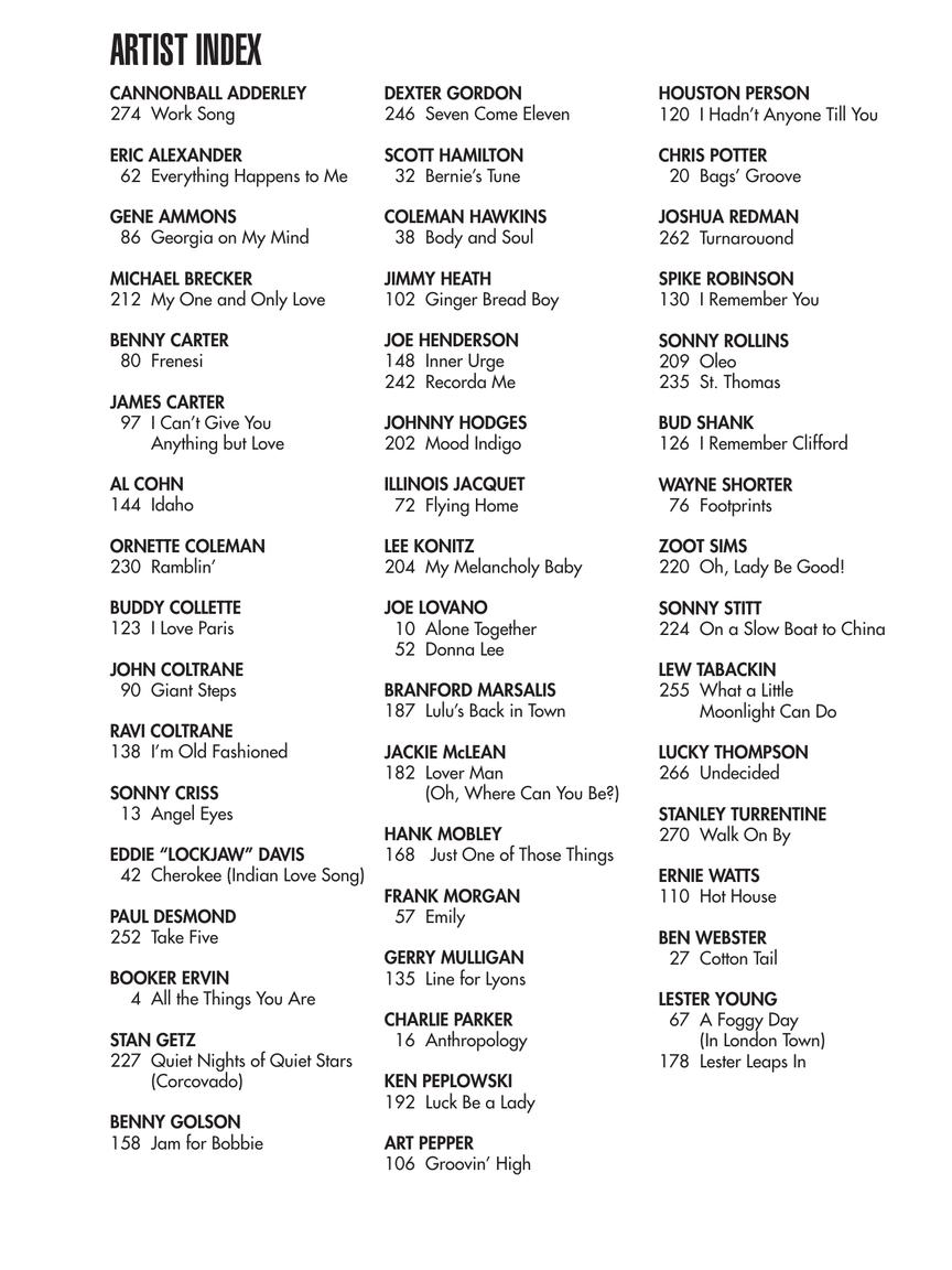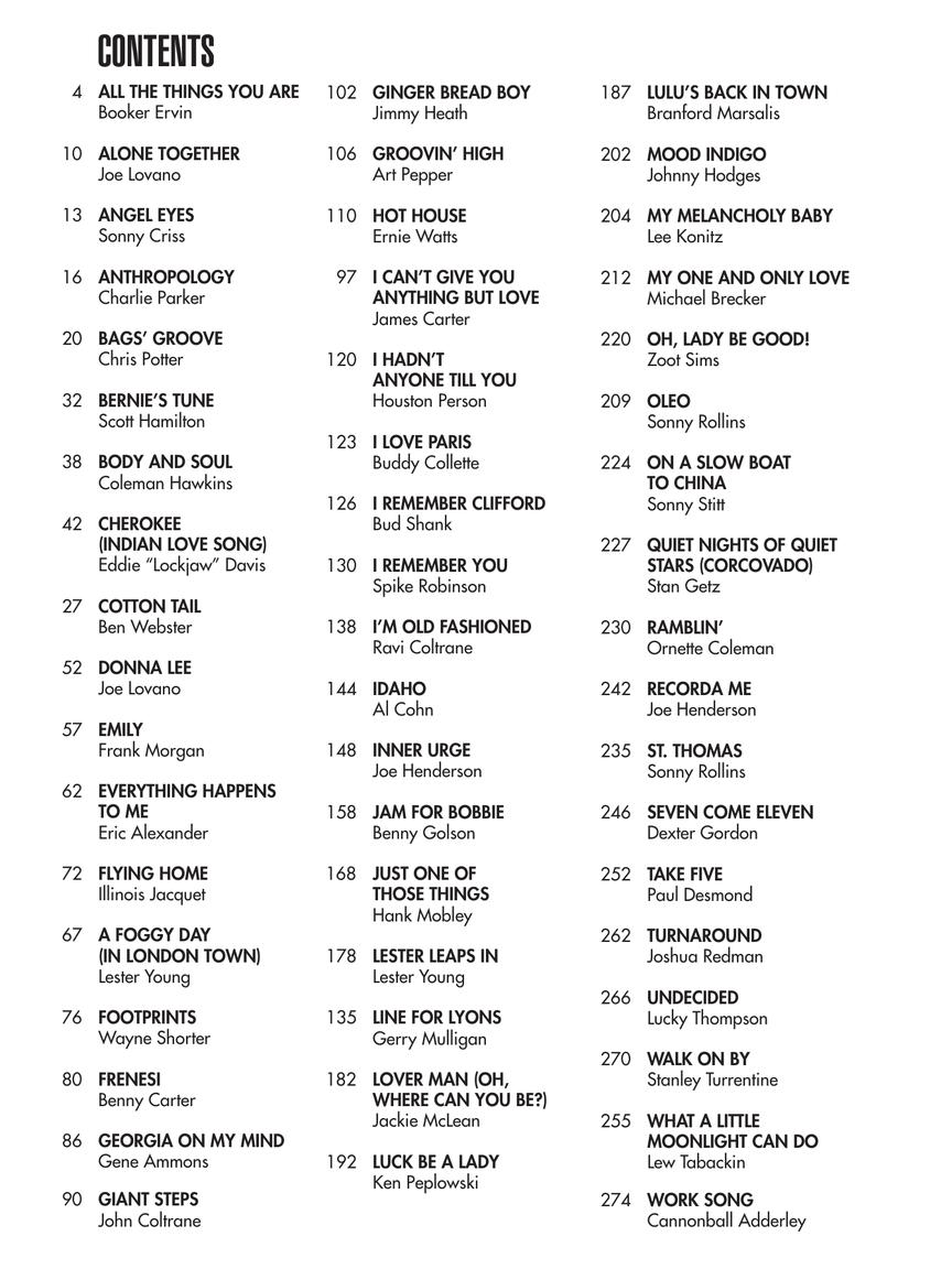 Esta última edição do Omnibook permite que os instrumentistas Bb toquem a música de alguns dos maiores ícones do saxofone de jazz de todos os tempos. O Saxofone Omnibook para instrumentos Bb apresenta 53 músicas transcritas exatamente como gravadas por artistas como Cannonball Adderley, John Coltrane, Stan Getz, Joe Henderson, Jackie McLean, Gerry Mulligan, Charlie Parker, Sonny Rollins e muito mais! Incluindo: All the Things You Are • Anthropology • Body and Soul • Cherokee (Indian Love Song) • Donna Lee • A Foggy Day (In London Town) • Frenesí • Georgia on My Mind • I Can't Give You Anything but Love • I Remember You • Just One of Those Things • Lester Leaps In • Lover Man (Oh, Where Can You Be?) • Luck Be a Lady • Mood Indigo • Seven Come Eleven • Take Five • Walk on By • What a Little Moonlight Can Do • e muitas outras.