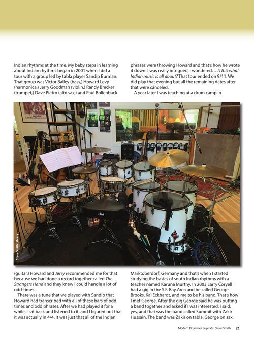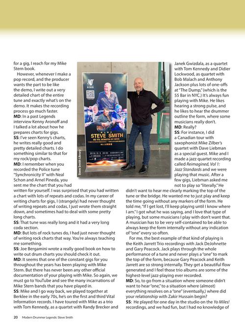 In the new Steve Smith Legends, you get a brand new 40-page interview which covers Steve's entire career and virtually every band and recording in which he's played as a sideman or a leader including: Jean-Luc Ponty, Ronnie Montrose, Steps Ahead, Vital Information, Mike Stern, Hiromi, the many editions of the band Electric Miles, the tribute gigs playing The Music of Coltrane and The Music of Ornette Coleman. We discuss what it means to be a professional drummer and musician, the history of jazz and fusion drumming, the music business, and being an eternal student of the drums and music. To help you study how Steve interprets music and creates drum parts, he gave us eight of his own handwritten drum charts from the Journey and Mike Stern gigs. The reader also gets an in-depth step-by-step lesson on Indian rhythms and drumming. LEGENDS also comes with a free download component of Steve's drum solo recording The Fabric of Rhythm (a $200 value) with exclusive in-depth explanations of each solo.