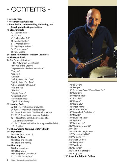 No novo livro "Steve Smith Legends", você encontrará uma entrevista inédita de 40 páginas que abrange toda a carreira de Steve e praticamente todas as bandas e gravações em que ele tocou como músico acompanhante ou líder, incluindo: Jean-Luc Ponty, Ronnie Montrose, Steps Ahead, Vital Information, Mike Stern, Hiromi, as diversas formações da banda Electric Miles, os shows tributo tocando a música de Coltrane e a música de Ornette Coleman. Discutimos o que significa ser um baterista e músico profissional, a história da bateria no jazz e no fusion, a indústria musical e a busca constante pelo aprendizado da bateria e da música. Para ajudar você a estudar como Steve interpreta a música e cria partes de bateria, ele nos forneceu oito partituras manuscritas de bateria dos shows com Journey e Mike Stern. O leitor também terá acesso a uma lição detalhada, passo a passo, sobre ritmos e percussão indianos. LEGENDS também inclui um download gratuito da gravação do solo de bateria de Steve, The Fabric of Rhythm, com explicações exclusivas e detalhadas de cada solo.