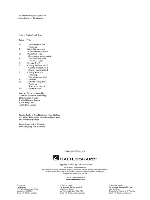 This is an instruction guide for basic through advanced bottleneck guitar. It features the most important riffs and exercises for slide guitar, plus 16 songs in the styles of Robert Johnson, Duane Allman, Ry Cooder and others. Tunes in open and standard tunings are included, written in standard notation and tablature. The accompanying audio is accessed through Hal Leonard's popular MyLibrary system using the provided code. The audio can be streamed or downloaded and includes PLAYBACK+, a multi-functional audio player that allows you to slow down audio without changing pitch, set loop points, change keys, and pan left or right.