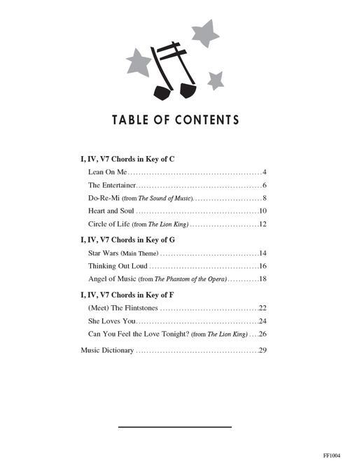 11 songs that include I-IV-V7 chords in the keys of C, G and F, featuring: Angel of Music • Do-Re-Mi • Heart and Soul • She Loves You • Star Wars • Thinking Out Loud • and more.