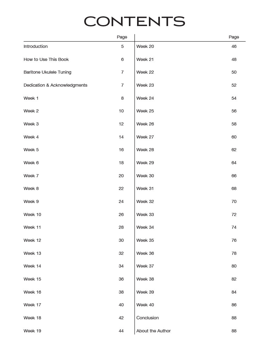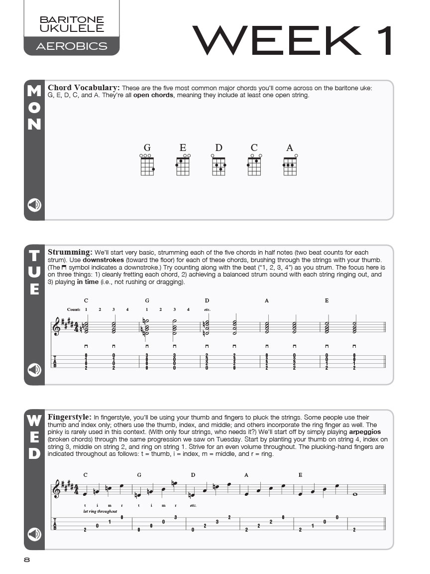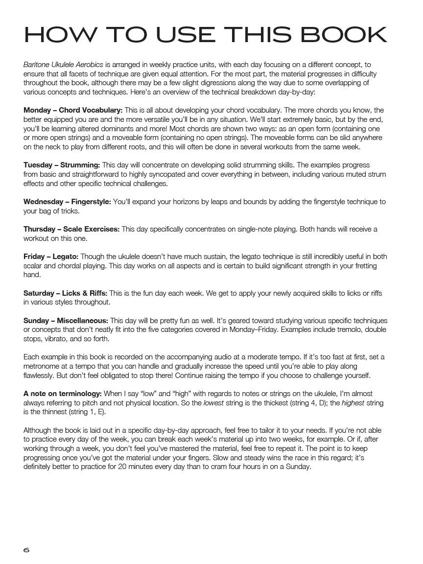 A 40-week, one-lick-per-day workout program for developing, improving, and maintaining baritone ukulele technique. This package provides practice material for every day of the week. The online audio includes all the workouts in the book, and the audio player PLAYBACK+ allows players to slow down the audio without changing pitch, set loop points, change keys, and more. Follow this program and you'll notice improved dexterity, increased speed, better accuracy, heightened coordination and more in your playing. Musical styles include pop, rock, blues, jazz, folk and more! Techniques covered include: strumming, fingerstyle, legato and staccato, hammer-ons and pull-offs, slides, bending, vibrato, tremolo, and much more.