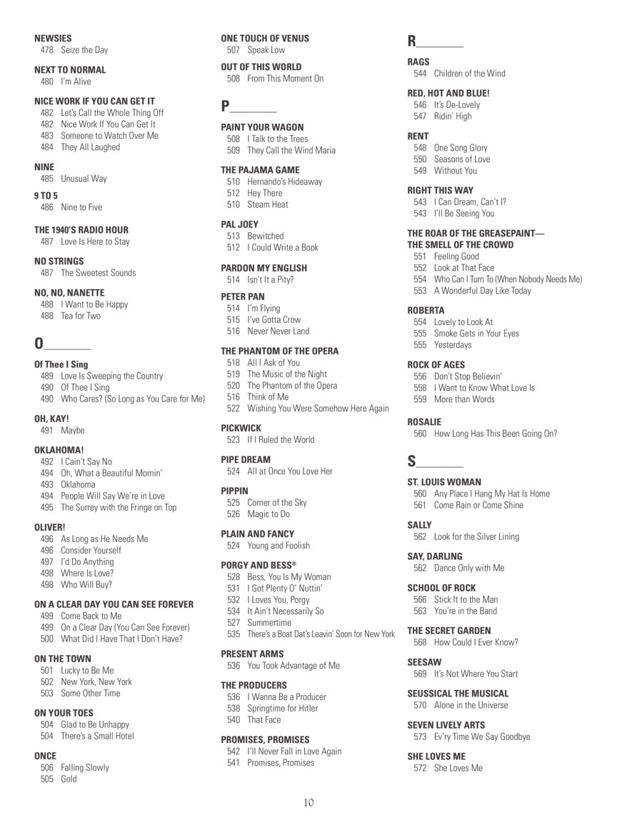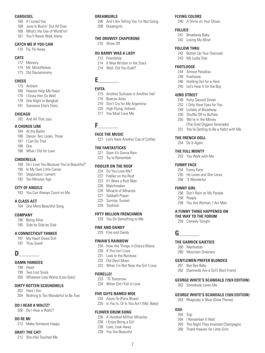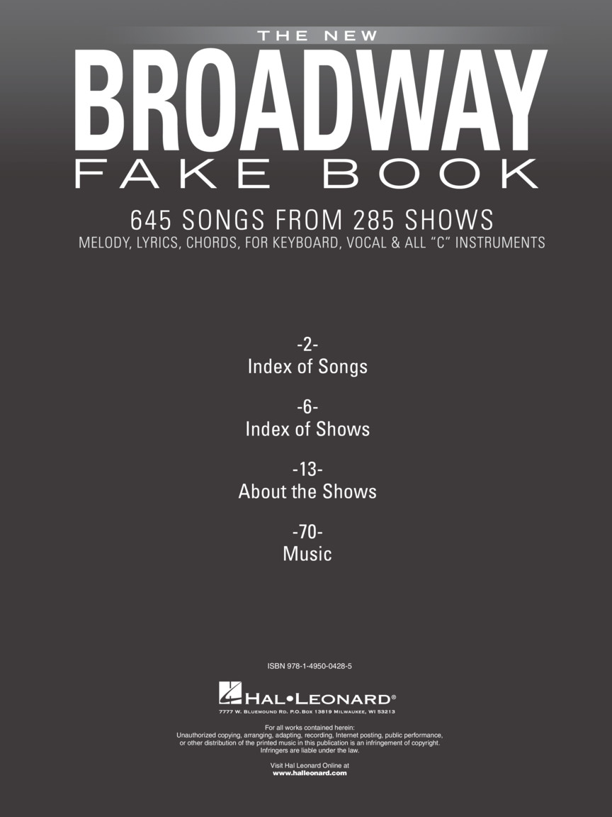 This amazing new collection features nearly 650 Broadway songs arranged with melody, lyrics and chords for C instruments. Definitely a must-own resource for any gigging or auditioning musician or actor! Includes: All I Ask of You • Always Look on the Bright Side of Life • And I Am Telling You I'm Not Going • Another Op'nin', Another Show • Any Dream Will Do • Anything Goes • Aquarius • Be Our Guest • Bess, You Is My Woman • Big Spender • Body and Soul • Brotherhood of Man • Brush up Your Shakespeare • But Not for Me • Castle on a Cloud • A Change in Me • Close Every Door • Consider Yourself • Dancing Queen • Defying Gravity • Do-Re-Mi • Don't Cry for Me Argentina • Don't Rain on My Parade • Edelweiss • Everything's Coming up Roses • Footloose • For Good • Forty-Second Street • Getting to Know You • Good Morning Baltimore • Grease • Hakuna Matata • Hello, Dolly! • Hey, Look Me Over • How Long Has This Been Going On? • I Dreamed a Dream • I Loved You Once in Silence • I Wanna Be a Producer • I'm Gonna Sit Right down and Write Myself a Letter • If I Were a Rich Man • The Impossible Dream (The Quest) • In My Life • Love Changes Everything • Mack the Knife • Mama, I'm a Big Girl Now • Mamma Mia • Memory • New York, New York • Nice Work If You Can Get It • Nine to Five • Oklahoma • On Broadway • On My Own • One • People • The Phantom of the Opera • Popular • Send in the Clowns • Seventy Six Trombones • Shall We Dance? • She Loves Me • Sit down You're Rockin' the Boat • Springtime for Hitler • Strike up the Band • Suddenly Seymour • The Surrey with the Fringe on Top • Thank Heaven for Little Girls • Tomorrow • Try to Remember • Under the Sea • Unusual Way • Walk like a Man • When I Grow Up • A Whole New World • Wishing You Were Somehow Here Again • You'll Never Walk Alone • Younger Than Springtime • and more!