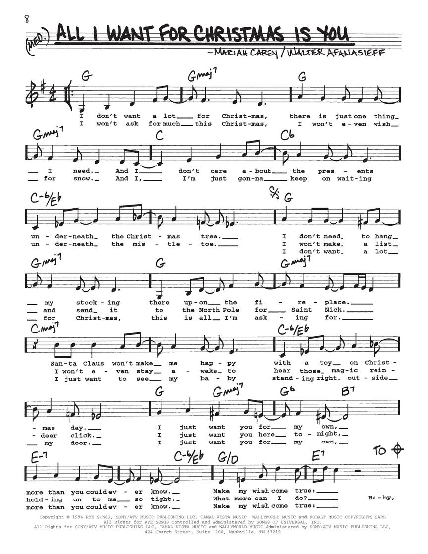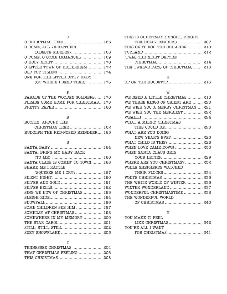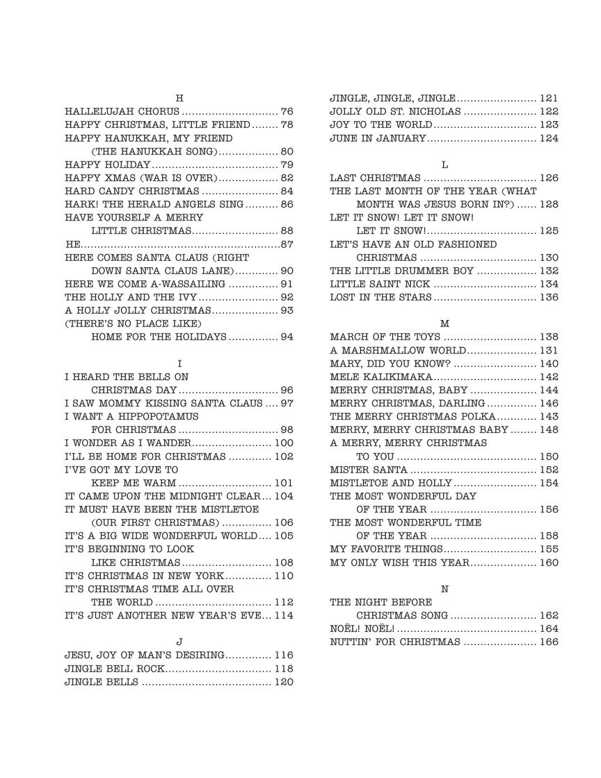 Songs include: All I Want for Christmas Is You • All I Want for Christmas Is My Two Front Teeth • Auld Lang Syne • Baby, It's Cold Outside • Blue Christmas • Christmas in Killarney • The Christmas Song (Chestnuts Roasting on an Open Fire) • Christmas Time Is Here • Dance of the Sugar Plum Fairy, Op. 71a • Have Yourself a Merry Little Christmas • I Heard the Bells on Christmas Day • I'll Be Home for Christmas • Last Christmas • Let It Snow! Let It Snow! Let It Snow! • Let's Have an Old Fashioned Christmas • Mary, Did You Know? • Merry Christmas, Darling • My Favorite Things • One for the Little Bitty Baby (Go Where I Send Thee) • Please Come Home for Christmas • Santa Baby • Sleigh Ride • Where Are You Christmas? • White Christmas • You're All I Want for Christmas • and more!