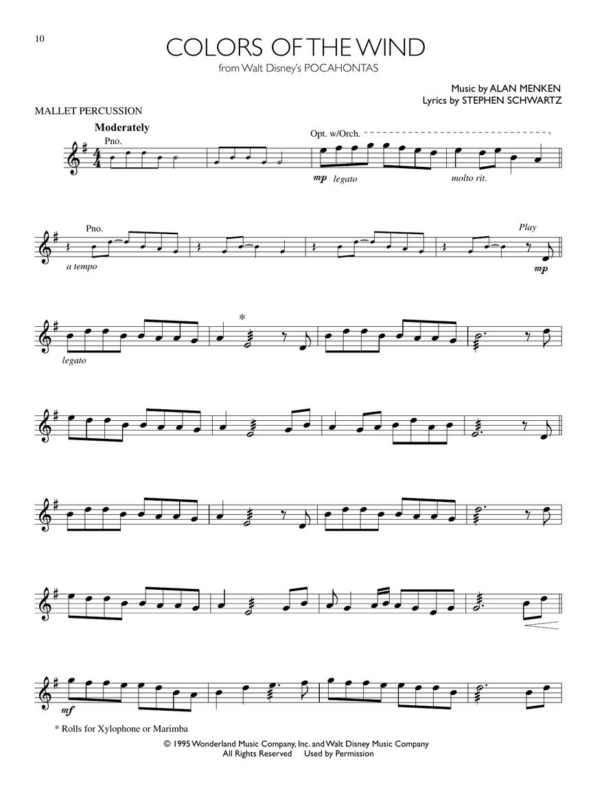 The long awaited mallet percussion edition of this series that includes recordings of full symphony orchestra backing tracks. 12 songs, including: Be Our Guest • The Bells of Notre Dame • Can You Feel the Love Tonight • Colors of the Wind • Friend like Me • I Just Can't Wait to Be King • Part of Your World • Reflection • Under the Sea • You'll Be in My Heart (Pop Version) • You've Got a Friend in Me • Zero to Hero.