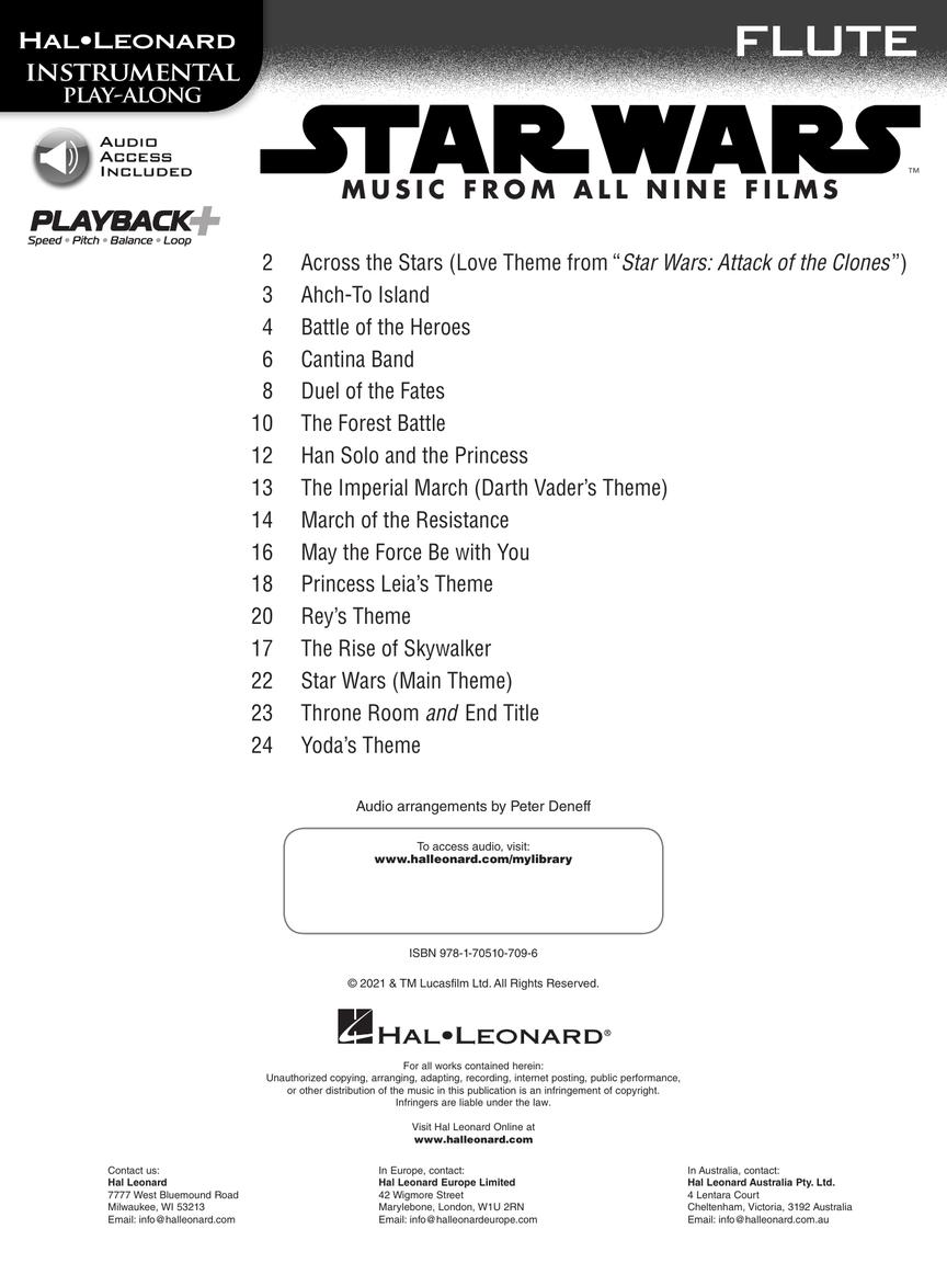 Play along with full accompaniments to your favorite Star Wars songs! This collection features solo arrangements of 16 favorite selections from all nine films in this epic series with excellent backing tracks that make you sound like a pro! Demonstration and backing tracks are provided for each song. Audio is accessed online using the unique code inside the book and can be streamed or downloaded. The audio files include PLAYBACK+, a multi-functional audio player that allows you to slow down audio without changing pitch, set loop points to master those challenging parts, change keys, and pan left or right. Includes: Across the Stars • Ahch-To Island • Battle of the Heroes • Duel of the Fates • The Forest Battle • The Imperial March (Darth Vader's Theme) • Rey's Theme • The Rise of Skywalker • Star Wars (Main Theme) • and more.
