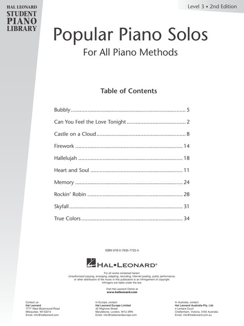 A superb collection of popular songs, sure to please the progressing student! Correlated with Hal Leonard Student Piano Library Piano Lessons Book 3, these arrangements are also a perfect supplementary choice for all methods. Includes both stand-alone solos, and student solos with teacher accompaniments.