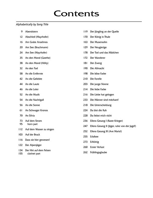 Contents: Abendstern • Abschied • Am Grabe Anselmos • Am See (Bruchmann) • Am See (Mayrhofer) • An den Mond (Goethe) • An den Mond (Hölty) • An den Tod • An die Entfernte • An die Geliebte • An die Laute • An die Leier • An die Musik • An die Nachtigall • An die Sonne • An Schwager Kronos • An Silvia • Auf dem Strom (high voice only) • Auf dem Wasser zu singen • Auf der Bruck • Das Abendrot (low voice only) • Dass sie hier gewesen! • Der Alpenjäger • Der Hirt auf dem Felsen (high voice only) • Der Jüngling an der Quelle • Der König in Thule • Der Musensohn • Der Neugierige • Der Tod und das Mädchen • Der Wanderer • Der Zwerg • Die Allmacht • Die böse Farbe • Die Forelle • Die junge Nonne • Die liebe Farbe • Die Liebe hat gelogen • Die Männer sind méchant! • Die Unterscheidung • Du bist die Ruh • Du liebst mich nicht • Ellens Gesang I (Raste Krieger) • Ellens Gesang II (Jäger, ruhe von der Jagd!) • Ellens Gesang III (Ave Maria!) • Erlafsee • Erlkönig • Erster Verlust • Frühlingsglaube • Ganymed • Geheimes • Grenzen der Menschheit • Gretchen am Spinnrade • Gruppe aus dem Tartarus • Heidenröslein • Heliopolis I • Heliopolis II • Herbst • Hoffnung • Im Abendrot • Im Frühling • Im Haine • Im Walde • Jägers Abendlied • Klaglied • Lachen und Weinen • Liebe schwärmt auf allen Wegen • Lied der Mignon (Hei mich nicht reden) • Lied der Mignon (So lasst mich scheinen) • Lied der Mignon (Nur wer die Sehnsucht kennt) • Litanei • Meeres Stille • Memnon • Mignons Gesang (Kennst du das Land) • Nacht und Träume • Nachtstück • Nachtviolen • Rastlose Liebe • Romanze (low voice only) • Schäfers Klagelied • Schwanengesang: Liebesbotschaft • Kriegers Ahnung • Frühlingssehnsucht • Ständchen • Aufenthalt • In der Ferne • Abschied (Rellstab) • Der Atlas • Ihr Bild • Das Fischermädchen • Die Stadt • Am Meer • Der Doppelgänger • Die Taubenpost • Sehsucht • Sei mir gegrüsst • Seligkeit • Ständchen • Suleika I • Verklärung • Wandrers Nachtleid I • Wandrers Nachtleid II • Wohin?