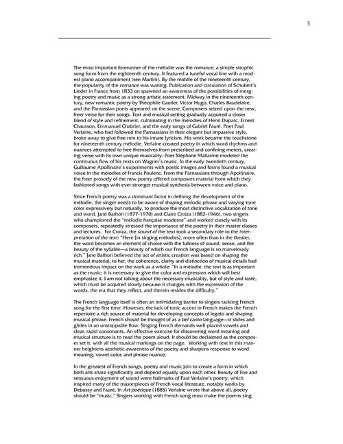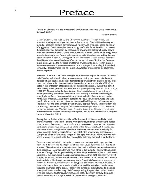 The largest, most comprehensive collection of French art songs ever published, with 60 songs by 24 composers. This wonderful anthology, with newly researched editions in clean new engravings, includes interesting notes about the composers, poets, facts about the composition and performance history for each song, and new line-by-line translations for study.