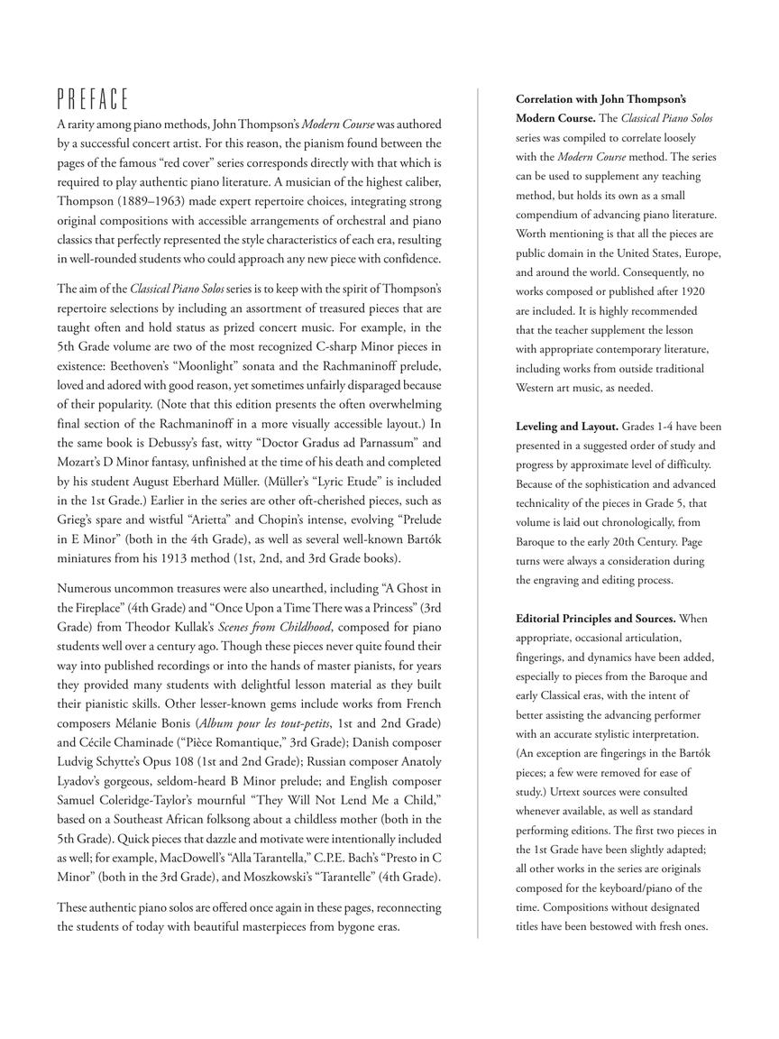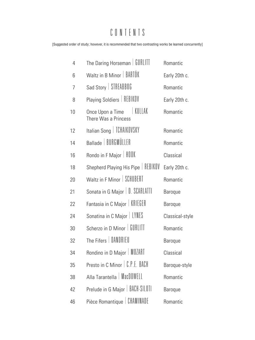 20 excellent pieces from the piano literature canon! This volume features a mix of well-known pieces such as Burgmüller's “Ballade” and Rebikov's “Playing Soldiers” plus lesser-known gems like CPE Bach's “Presto” – a fast, motivating recital piece, and the lovely, lyrical “Piece Romantique” by Cecile Chaminade.
