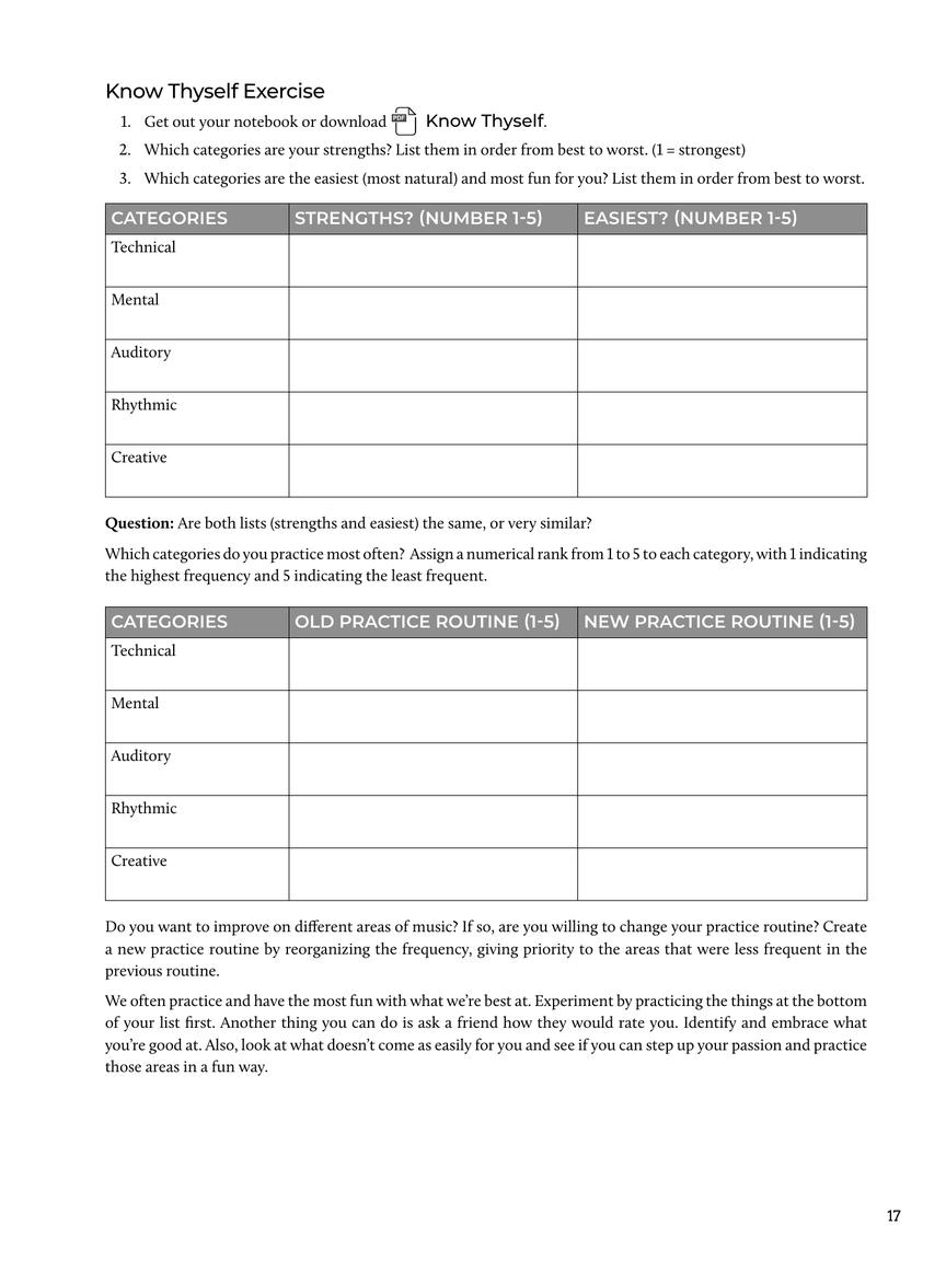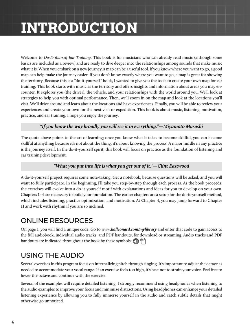 Do-It-Yourself Ear Training is designed to empower you with essential listening skills, problem-solving abilities, goal setting, and a deeper understanding of yourself as a musician. Develop a strong musical intuition, by diving into introspective exercises designed to explore your musical identity and unlock your full potential as a musician on your terms. The power to cultivate your ear and deepen your understanding of music is now literally in your hands – no matter where you are!