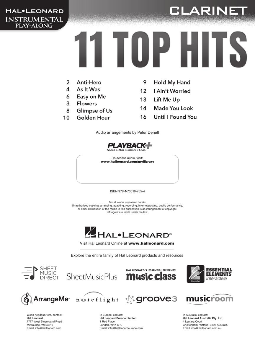 Agora os instrumentistas podem tocar junto com alguns dos maiores sucessos da atualidade! Esses cancioneiros apresentam arranjos instrumentais solo com demonstrações gravadas profissionalmente e faixas de apoio para que, depois de um pouco de prática, você possa soar como se estivesse tocando com a banda! As músicas incluem: Anti-Hero (Taylor Swift) • As It Was (Harry Styles) • Easy on Me (Adele) • Flowers (Miley Cyrus) • Glimpse of Us (Joji) • Golden Hour (JVKE) • Hold My Hand (Lady Gaga) • I Ain't Worried (One Republic) • Lift Me Up (Rihanna) • Made You Look (Megan Trainor) • Until I Found You (Stephen Sanchez).