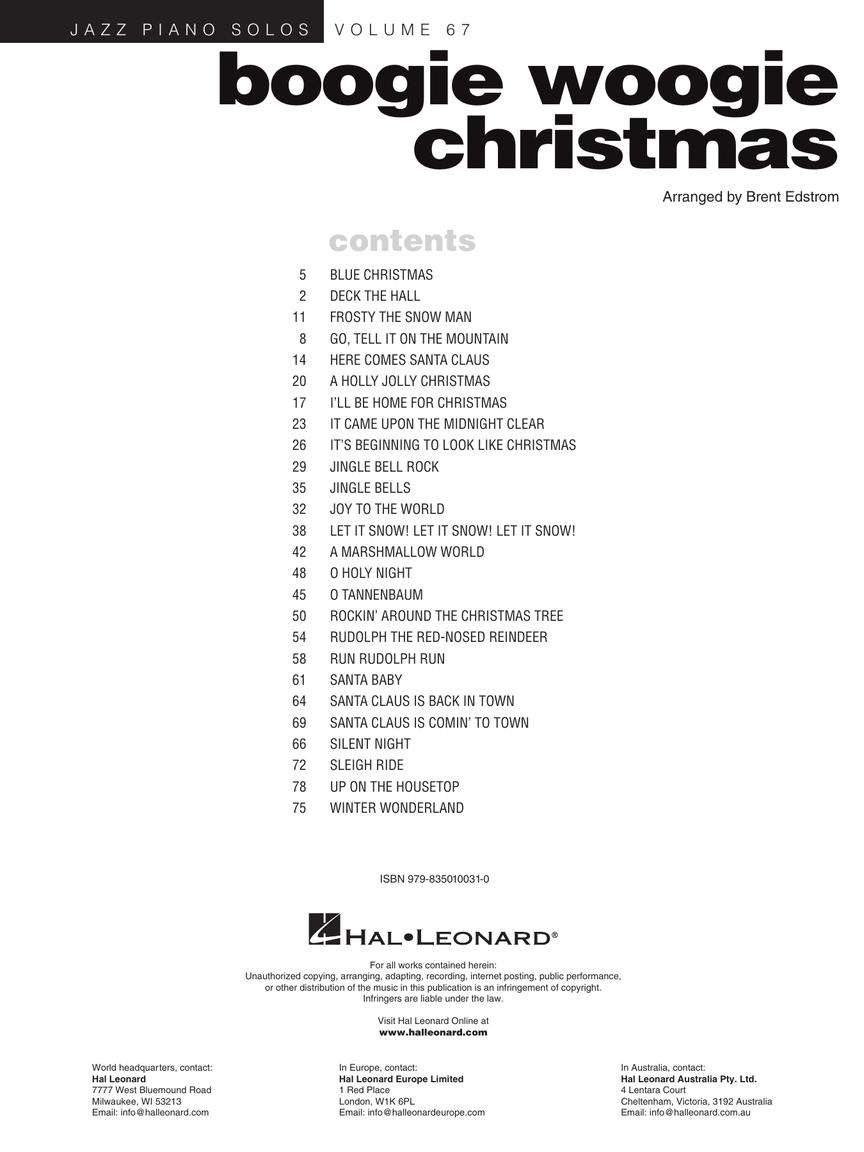 Transcrições para piano solo de músicas natalinas com um toque de Boogie Woogie. Esta edição traz 31 temas. Incluindo: Blue Christmas • Deck the Hall • Feliz Navidad • Frosty the Snowman • Go, Tell It on the Mountain • Here Comes Santa Claus (Right Down Santa Claus Lane) • A Holly Jolly Christmas • I'll Be Home for Christmas • It Came Upon the Midnight Clear • It's Beginning to Look Like Christmas • Jingle Bell Rock • Jingle Bells • Joy to the World • Let It Snow! Let It Snow! Let It Snow! • Little Saint Nick • March, Op. 71a • A Marshmallow World • O Holy Night • O Tannenbaum • Rockin' Around the Christmas Tree • Rudolph the Red-Nosed Reindeer • Run Rudolph Run • Santa Baby • Santa Claus Is Back in Town • Santa Claus Is Comin' to Town • Silent Night • Silver Bells • Sleigh Ride • Up on the Housetop • White Christmas • Winter Wonderland.