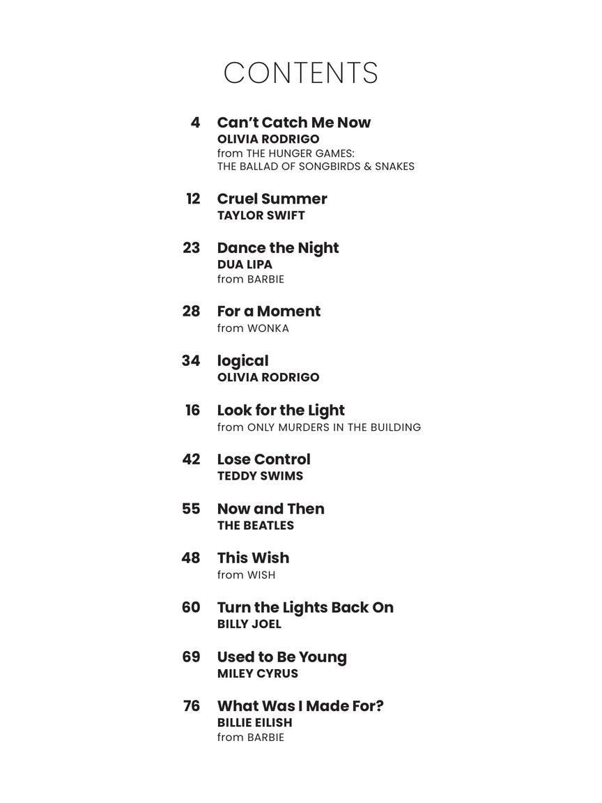Want to play the latest hits by Olivia, Taylor, Dua, Miley, or Billie? This folio features 12 of the biggest hits from 2023 and 2024 in one convenient collection. Each song is arranged for piano and voice with guitar chords. Songs include: Cruel Summer • Dance the Night • Lose Control • Used to Be Young • What Was I Made For? • and more.