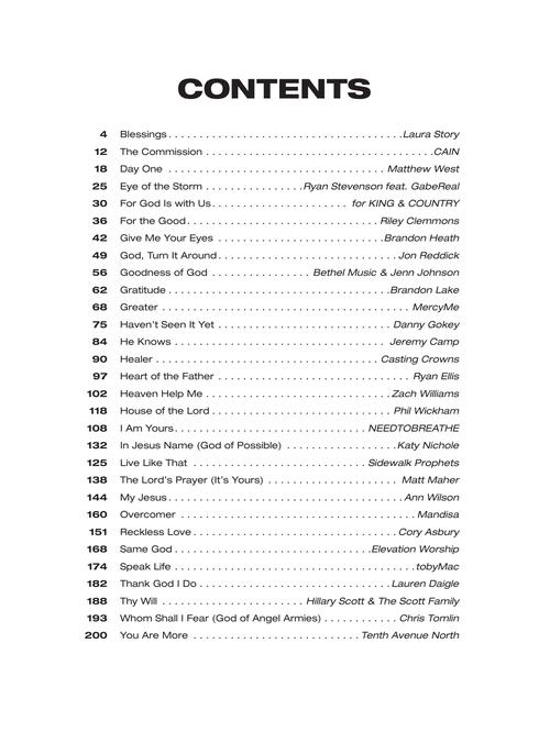 Now you can play 30 top singles from your favorite Christian artists, including Cory Asbury, Cain, For King & Country, Lauren Daigle, Brandon Heath, Jenn Johnson, Brandon Lake, Katy Nichole, Laura Story, Phil Wickham, and more! Each song is arranged for piano and voice with guitar chord frames. Songs include: Blessings • The Commission • For God Is with Us • Give Me Your Eyes • Goodness of God • Greater • Healer • House of the Lord • In Jesus Name (God of Possible) • The Lord's Prayer (It's Yours) • Reckless Love • Speak Life • and more!