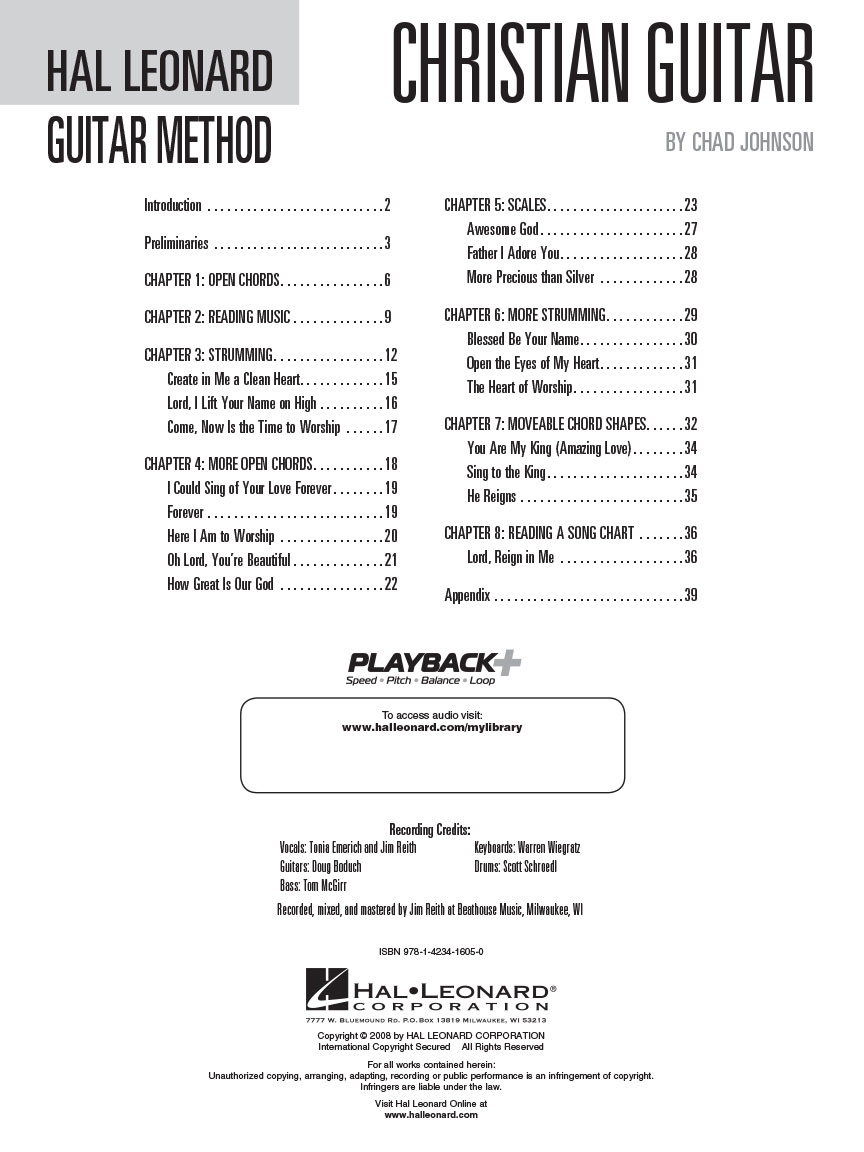 The Hal Leonard Christian Guitar Method is designed for anyone just learning to play guitar. This comprehensive and easy-to-use beginner's guide uses well-known praise and worship songs to teach you the basics of guitar style and technique. The accompanying audio features all of the songs in the book for demonstration and play-along.
