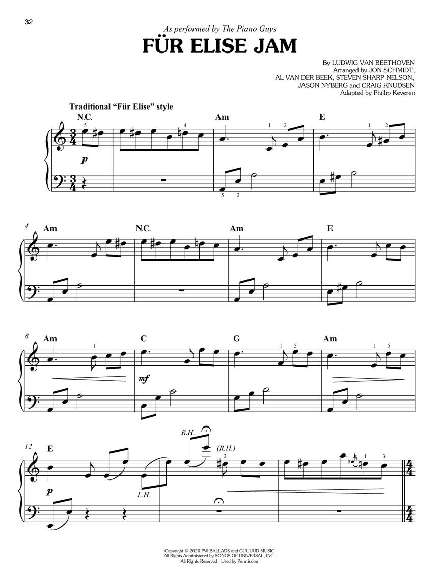 15 of The Piano Guys' best-loved songs arranged so YOU can play them! Phillip Keveren has done a superb job of adapting these arrangements for easy piano. Titles: Beethoven's 5 Secrets • Bless the Broken Road • Bring Him Home • Can't Help Falling in Love • Fight Song/Amazing Grace • Fur Elise Jam • Just the Way You Are • A Million Dreams • O Come O Come Emmanuel • Perfect • A Sky Full of Stars • Someone You Loved • Sweet Child o' Mine • A Thousand Years • Unstoppable.
